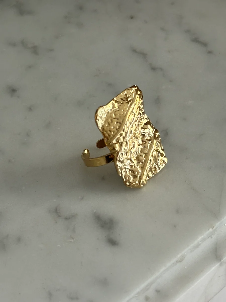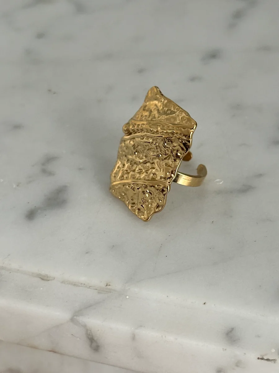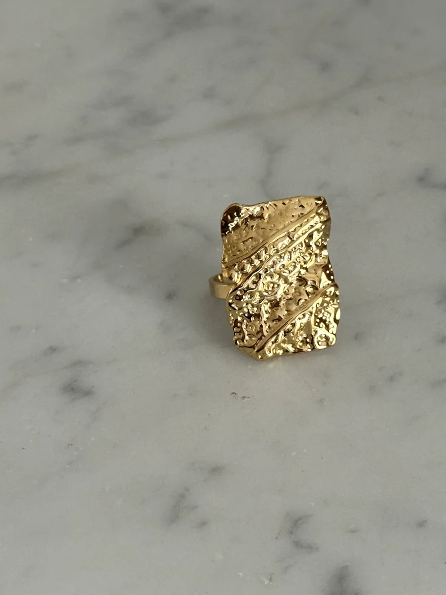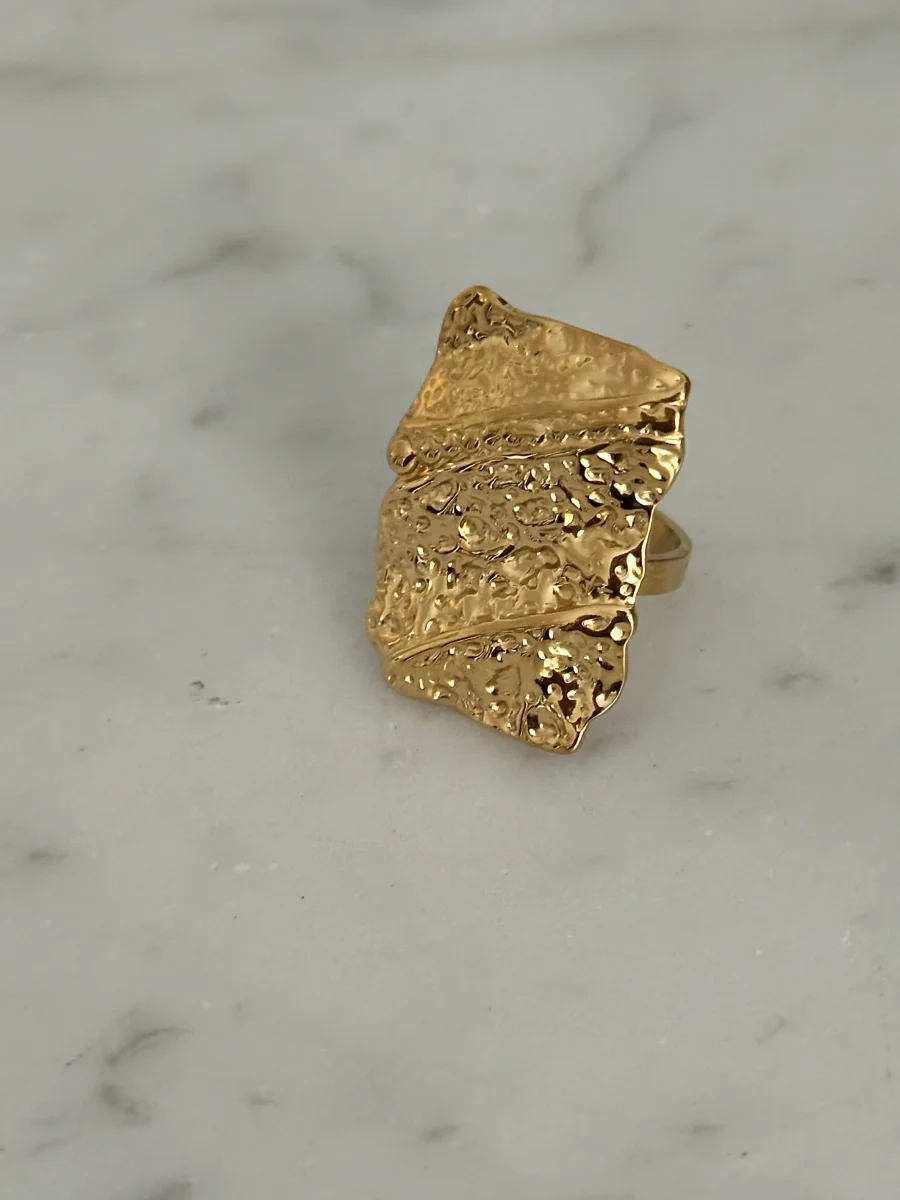 Bague dorée en rectangle à vague à effet martelé Bague en acier inoxydable : sa couleur ne noircit pas au contact de l’eau Sans risque allergène