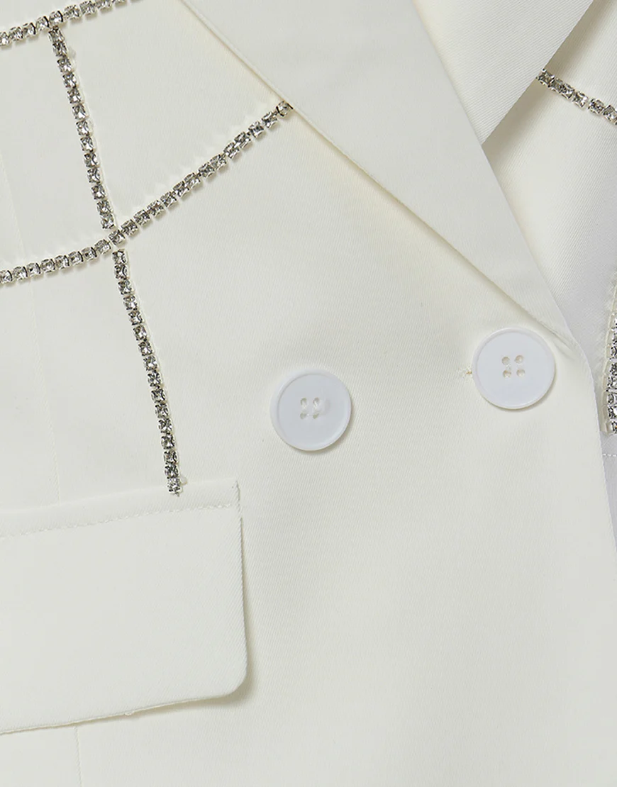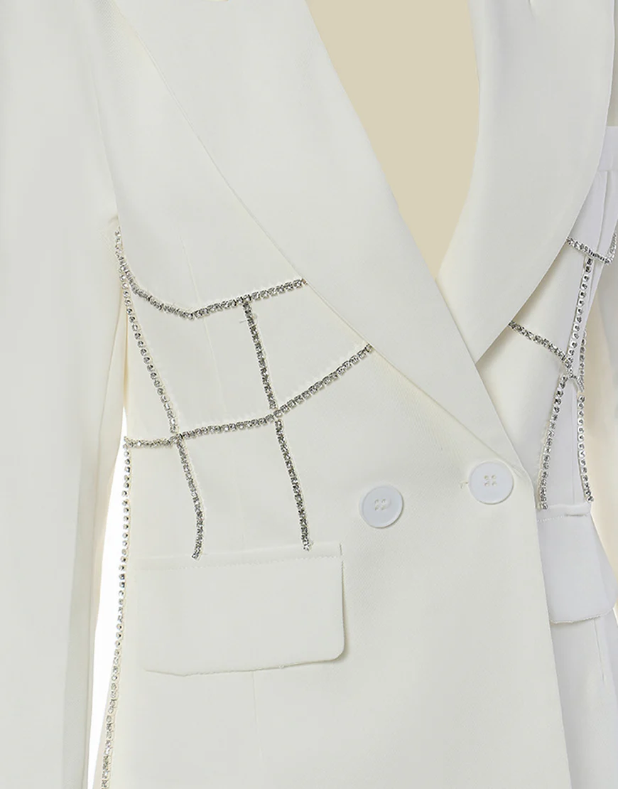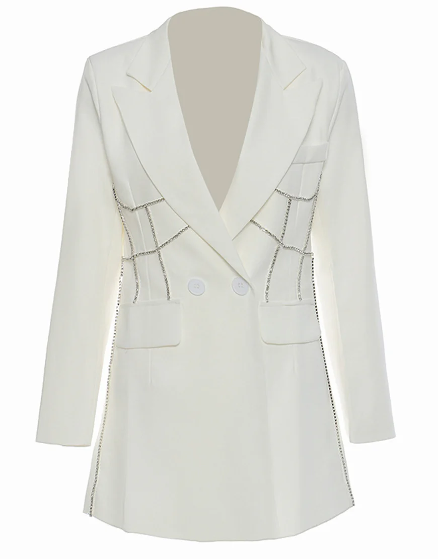 Blazer féminin ajusté moulant, avec revers pointus blancs, double boucle et décorations en cristaux