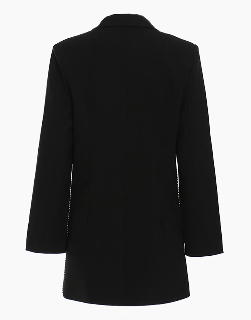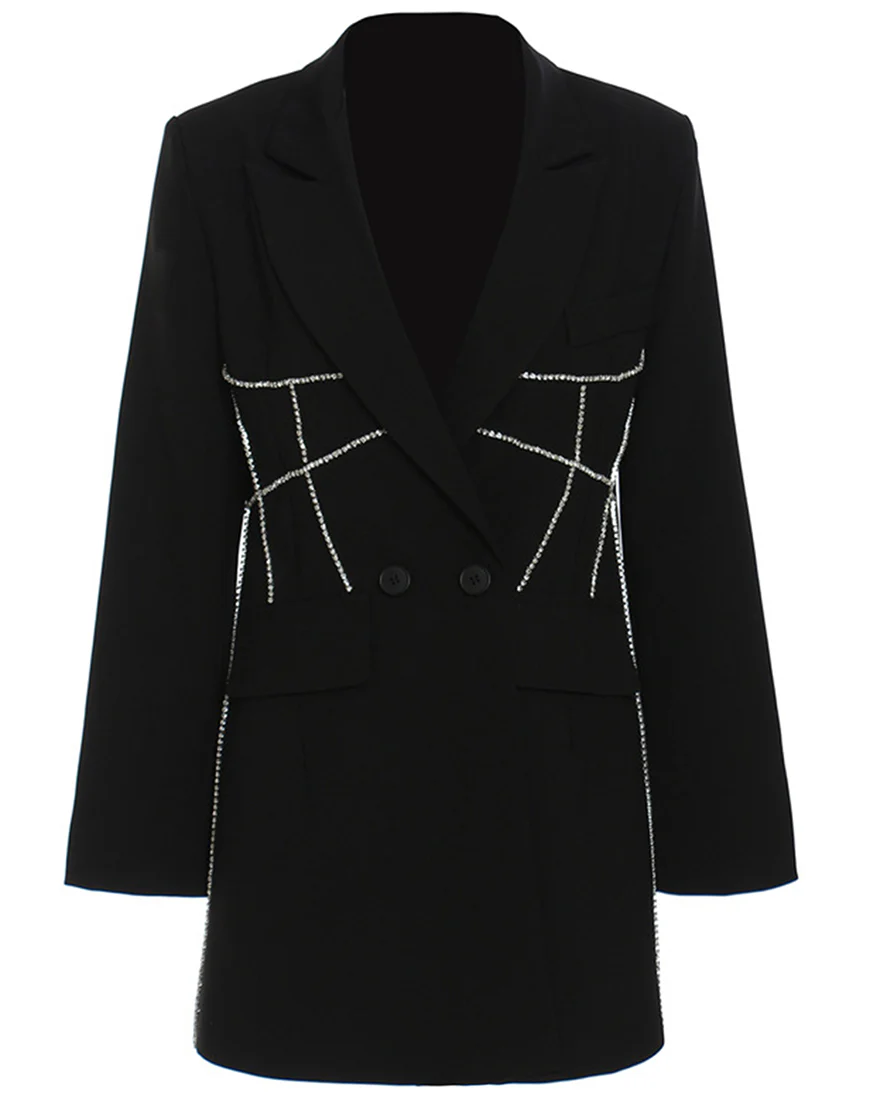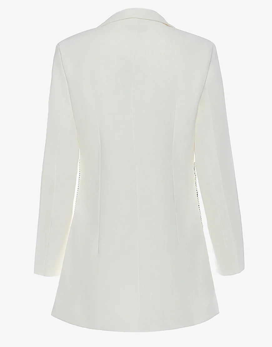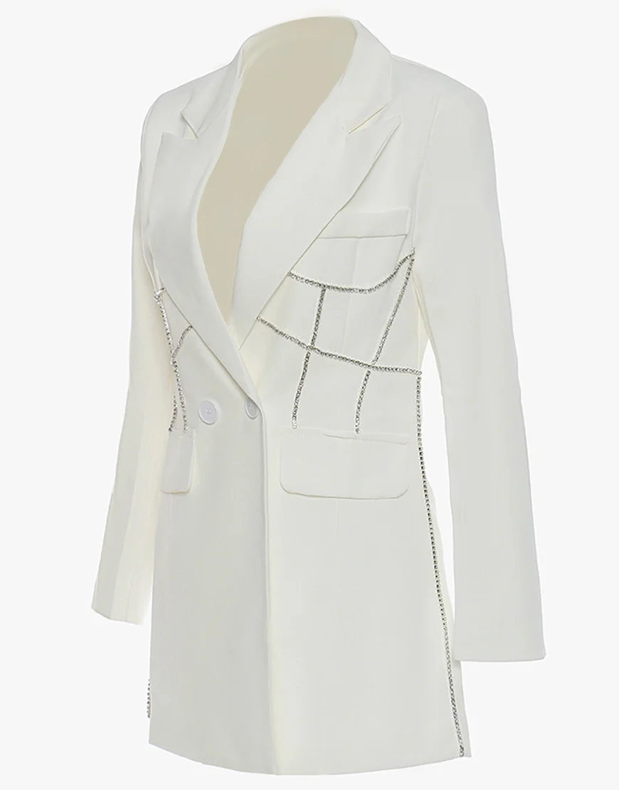 Blazer féminin ajusté moulant, avec revers pointus blancs, double boucle et décorations en cristaux