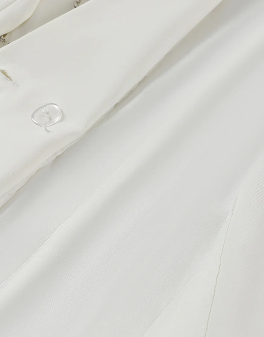 Soyez le premier à laisser votre avis sur “Blazer féminin ajusté moulant, avec revers pointus blancs, double boucle et décorations en cristaux”