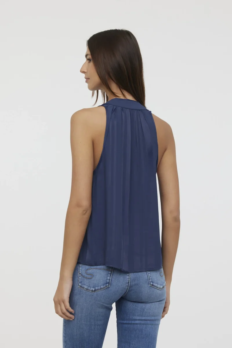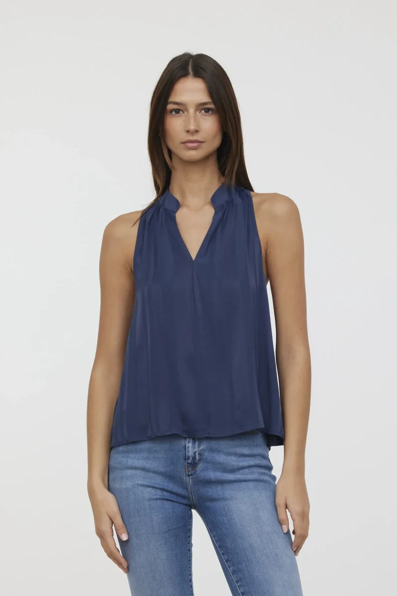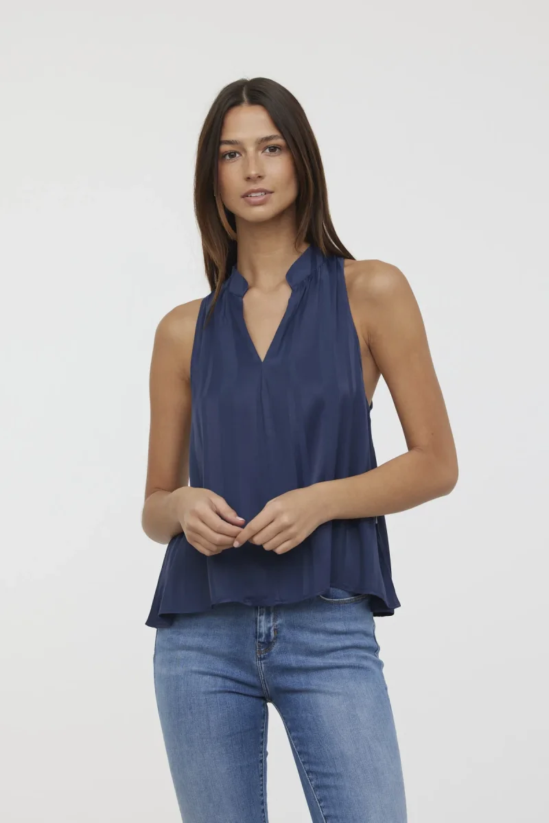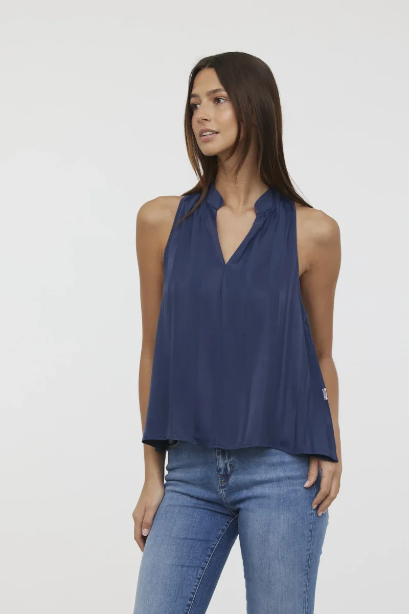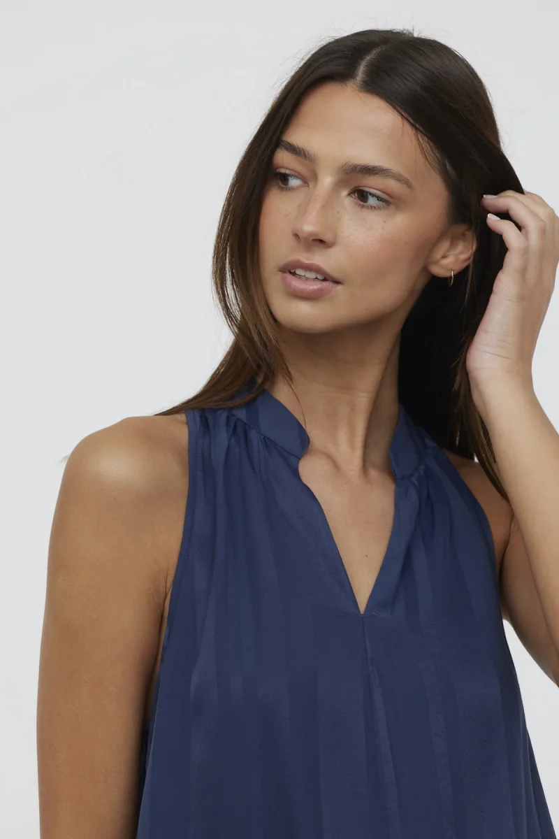 Blouse sans manches col mao bas évasé jacquard satiné rayé