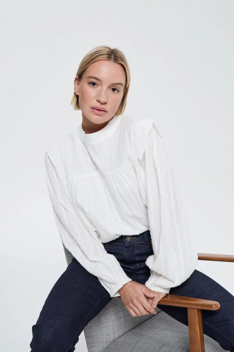 Dotée de manches longues légèrement bouffantes et resserrées aux poignets, elle ajoute du volume tout en douceur. Son encolure montante froncée avec petit bouton au dos apporte une touche sophistiquée, tandis que les fronces sous l’empiècement poitrine créent un joli tombé fluide et féminin.