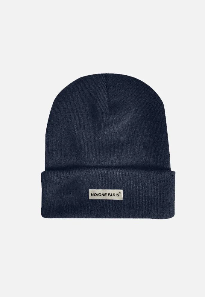 Bonnet navy en acrylique unisexe avec étiquette no/one paris sur le devant. Fabriqué avec un tissu riche et un style classique, ce bonnet est un ajout intemporel à toute garde-robe.