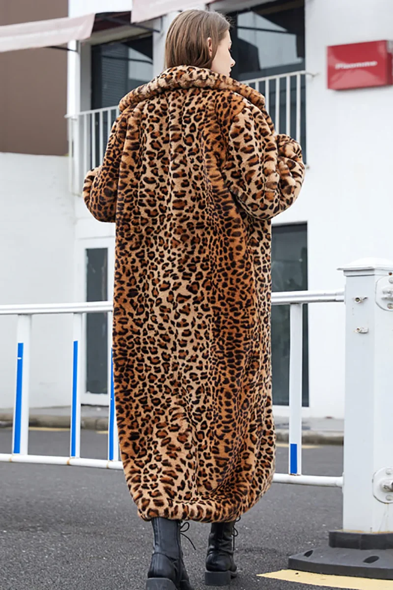 Brown Leopard Notched Lapel Faux Fur Shearling Coat