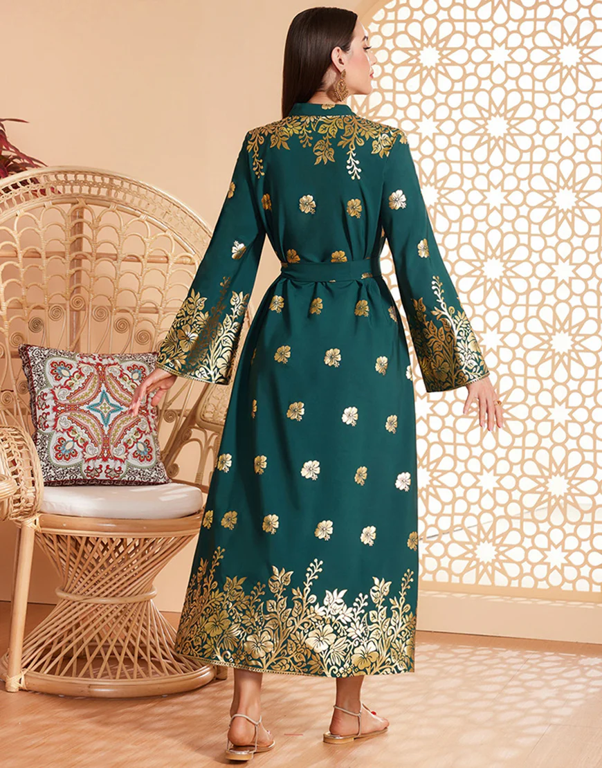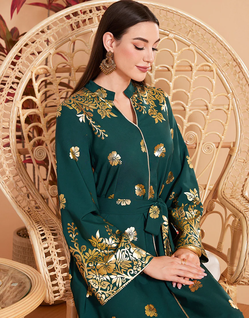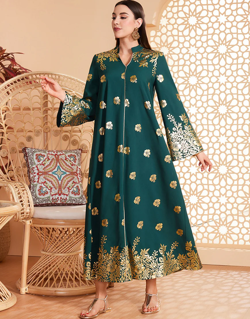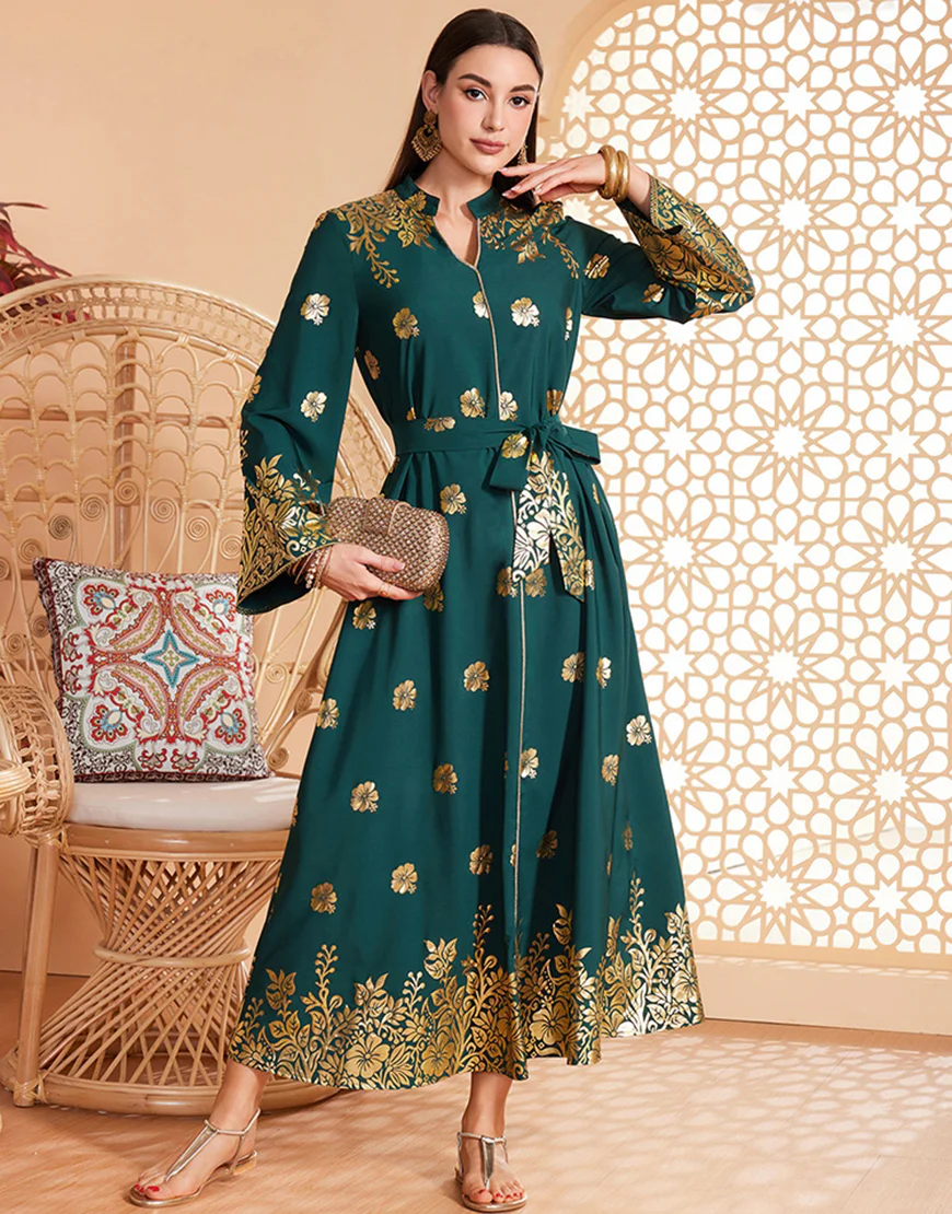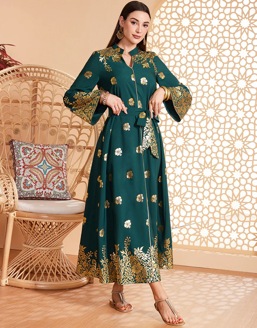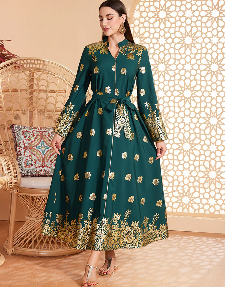 A-Line Manches Longues imprimées Arabe Maxi Abaya Robe