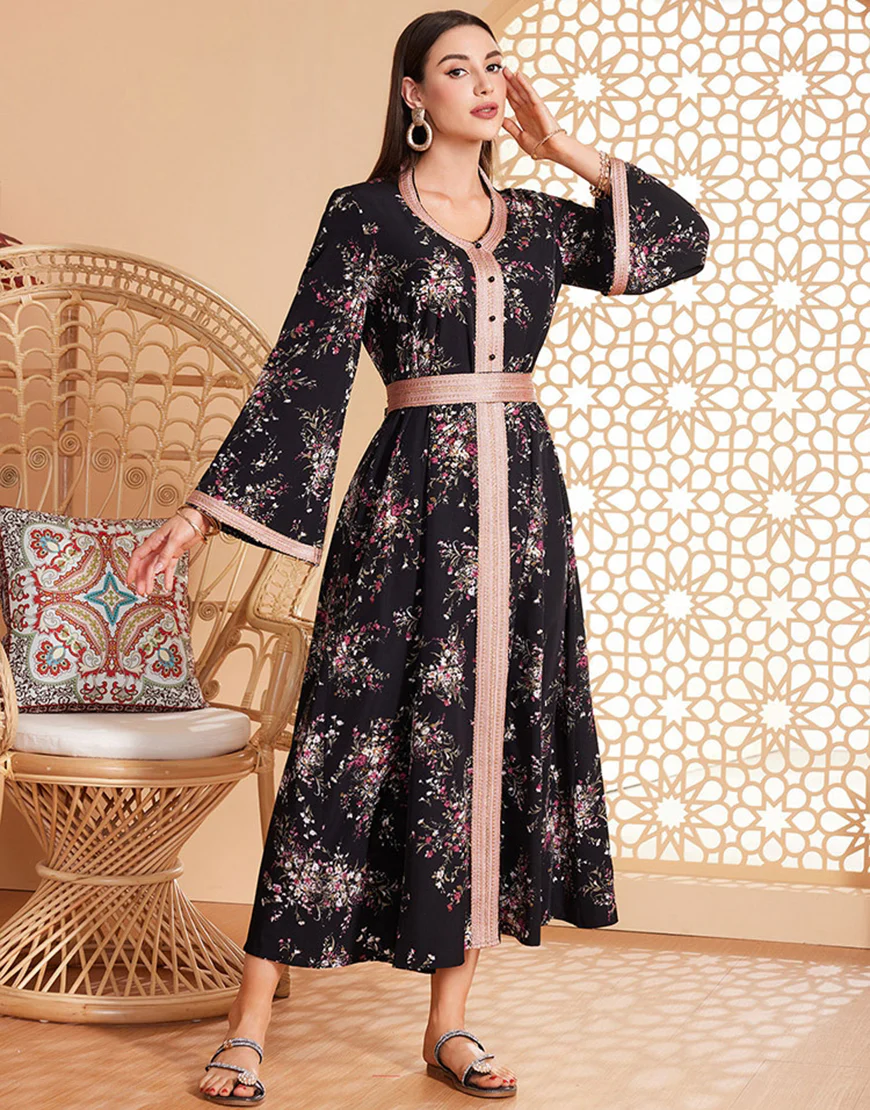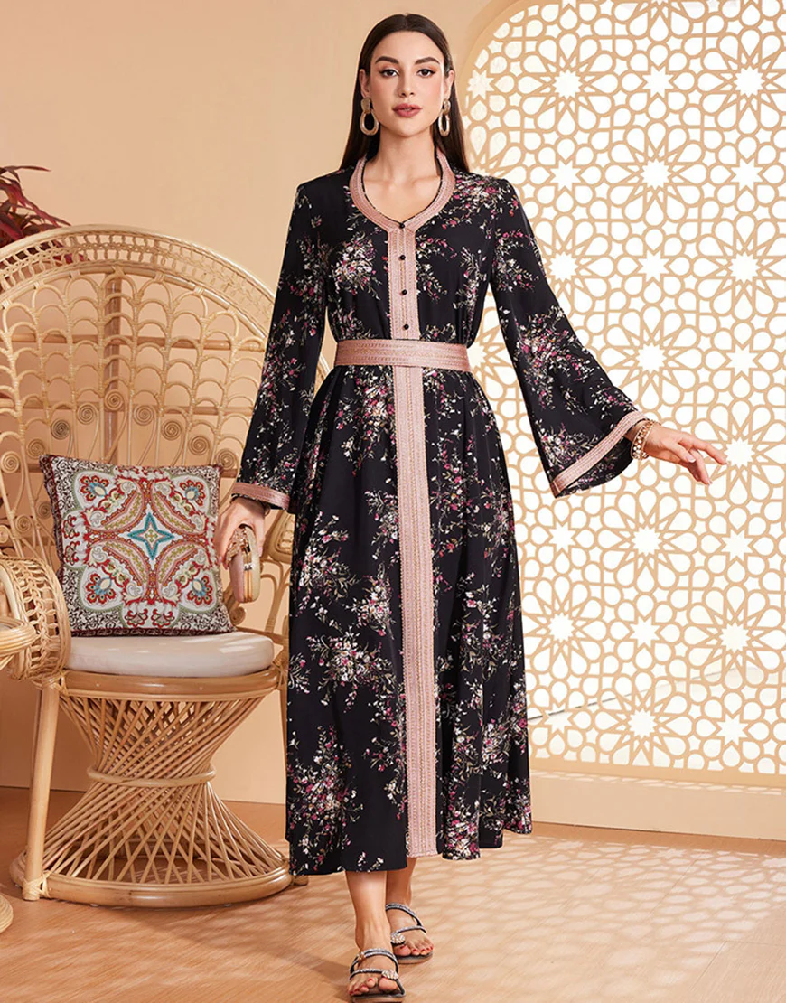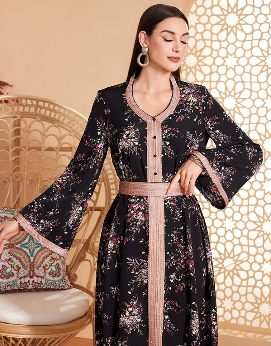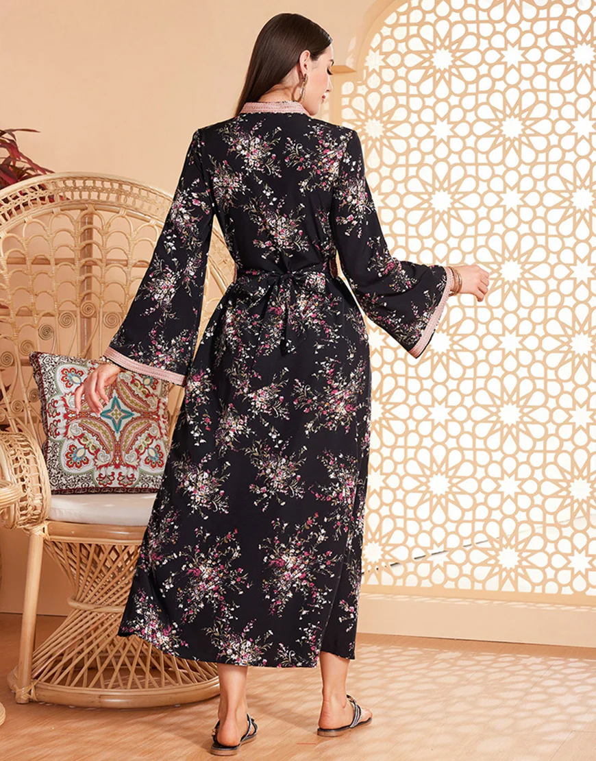 Caftan marocain ceinturé à manches longues et imprimé floral noir