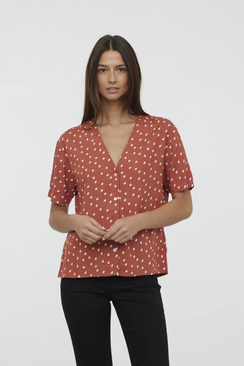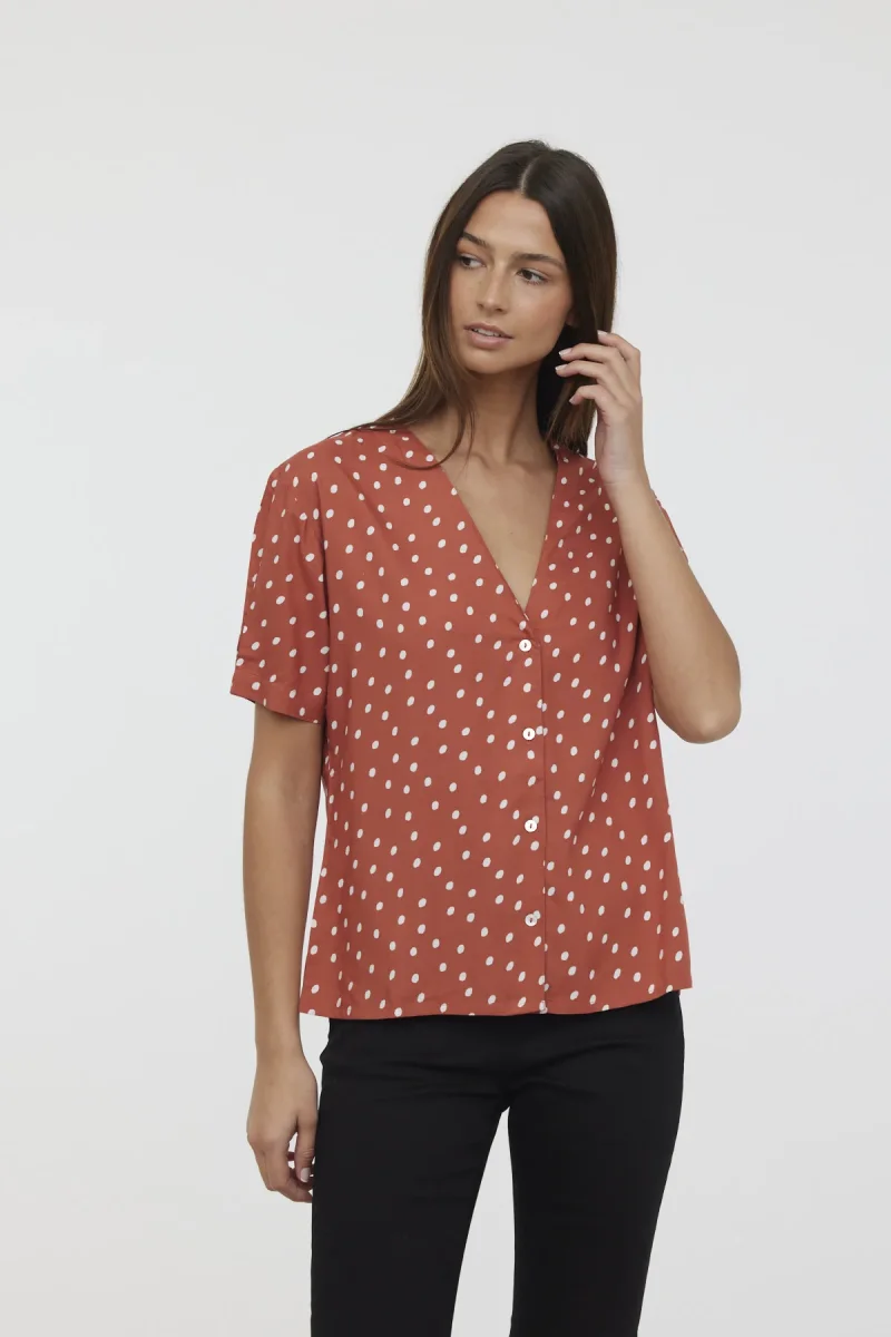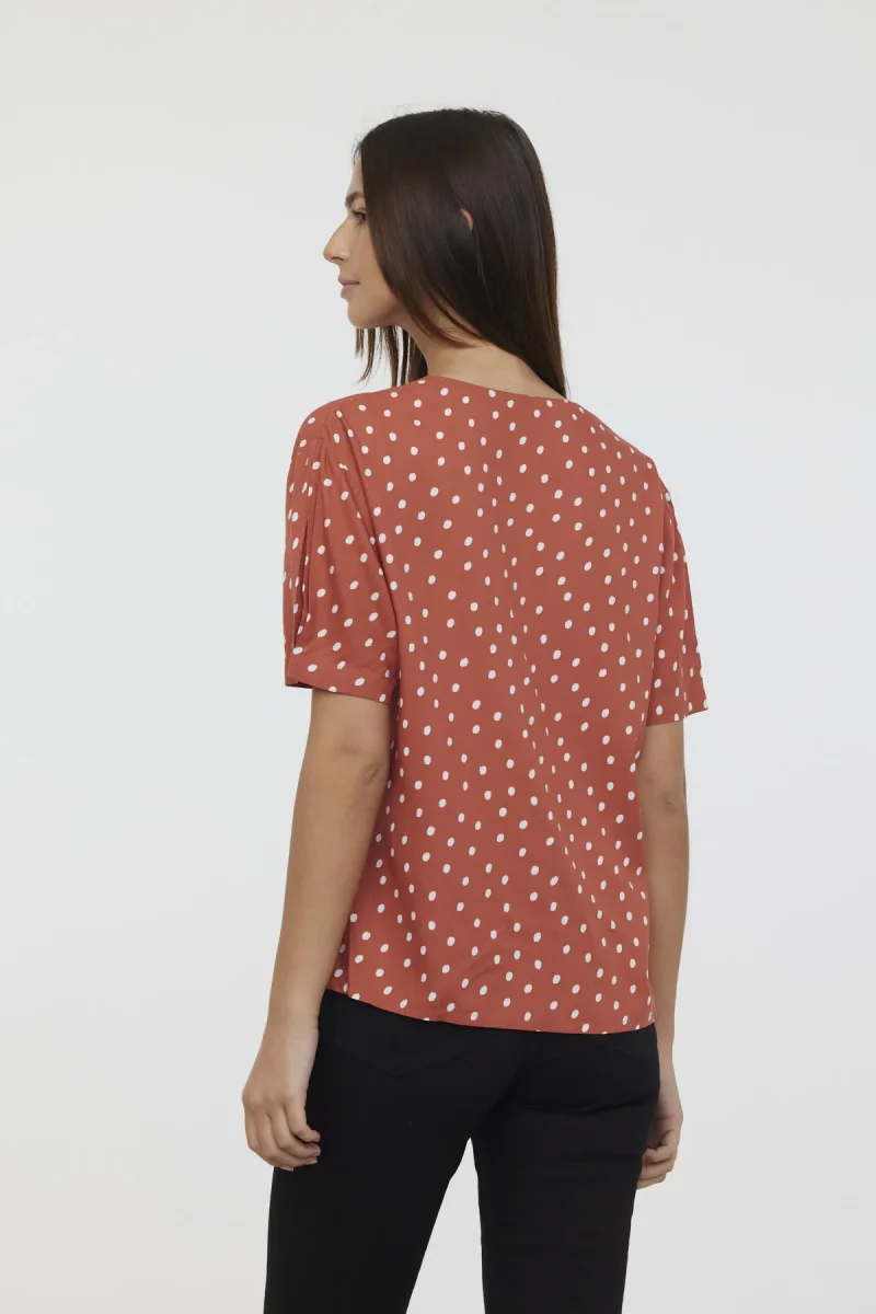 Chemise manches courtes bouffantes col V imprimé pois bas asymétrique