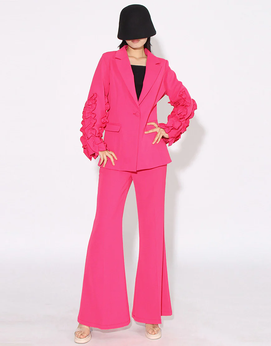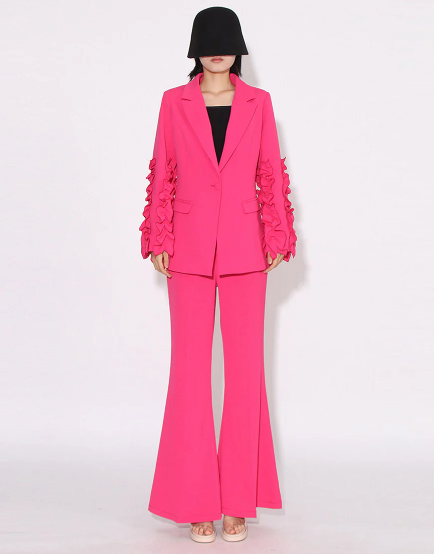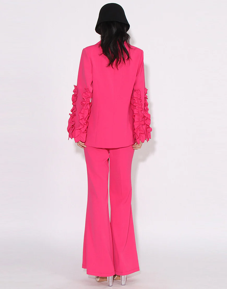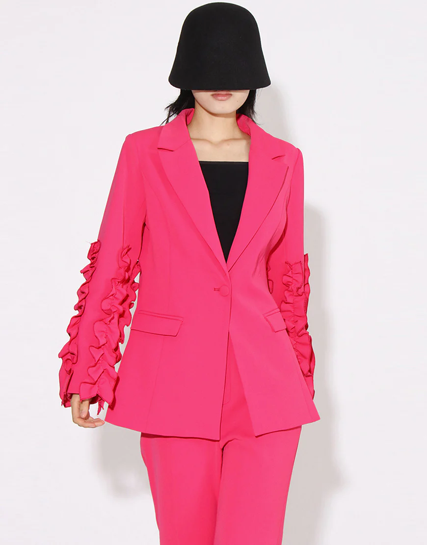 Soyez le premier à laisser votre avis sur “Costume de femme fuchsia à revers en pointe, à une boucle unique, avec manches à volants en deux pièces”