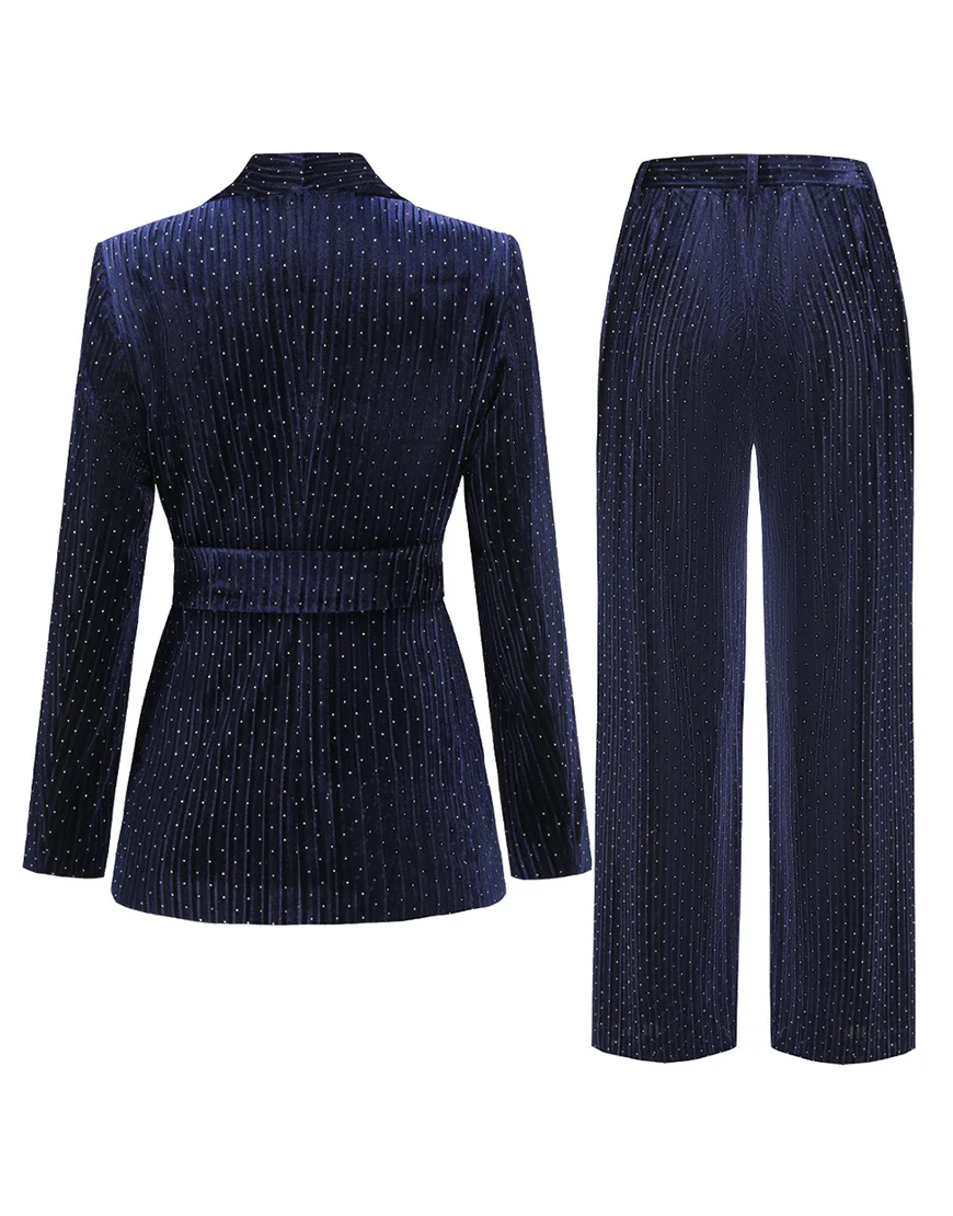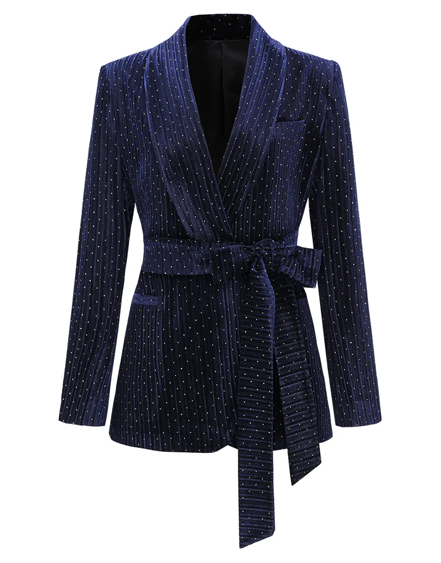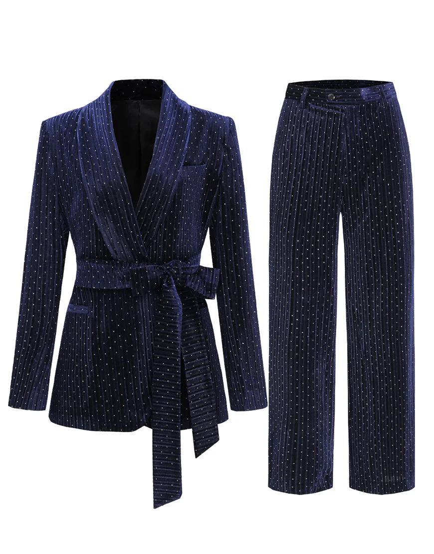 Soyez le premier à laisser votre avis sur “Costume féminin slim fit à rayures fines blanches tachetées avec revers en cachemire bleu marine et ceinture”