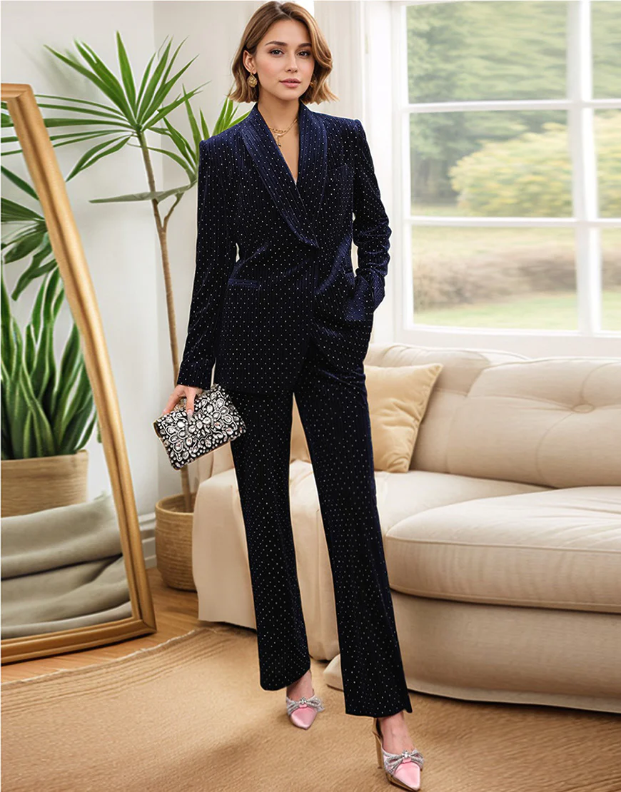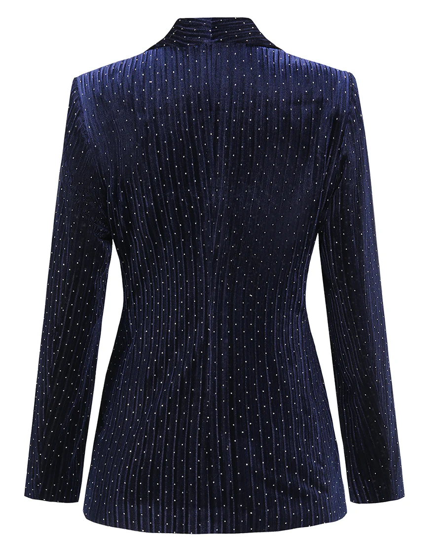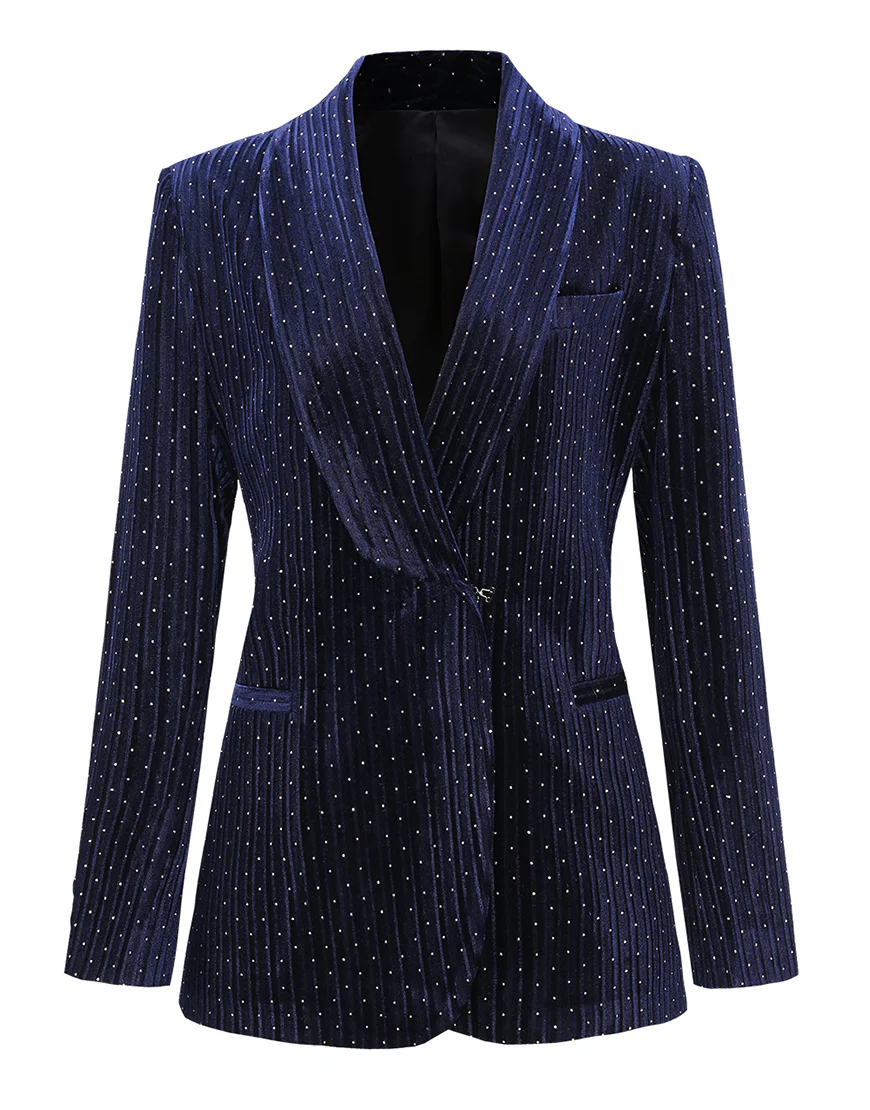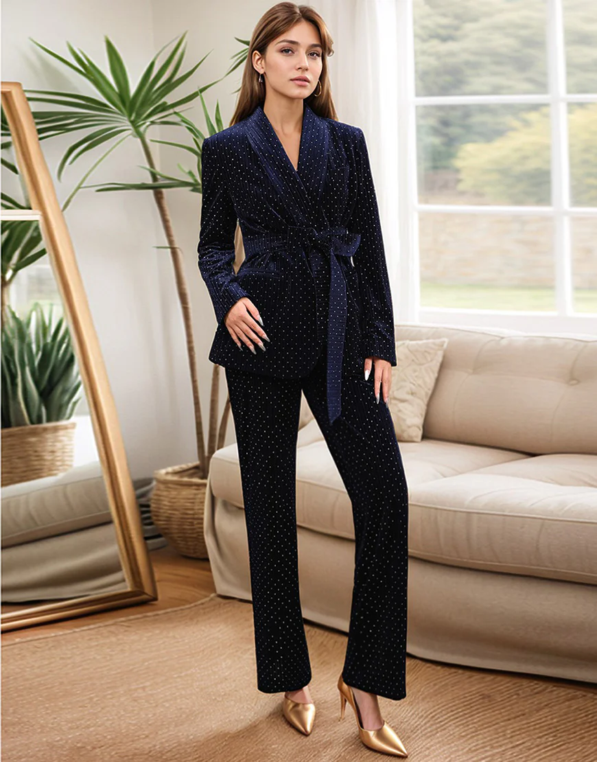 Soyez le premier à laisser votre avis sur “Costume féminin slim fit à rayures fines blanches tachetées avec revers en cachemire bleu marine et ceinture”