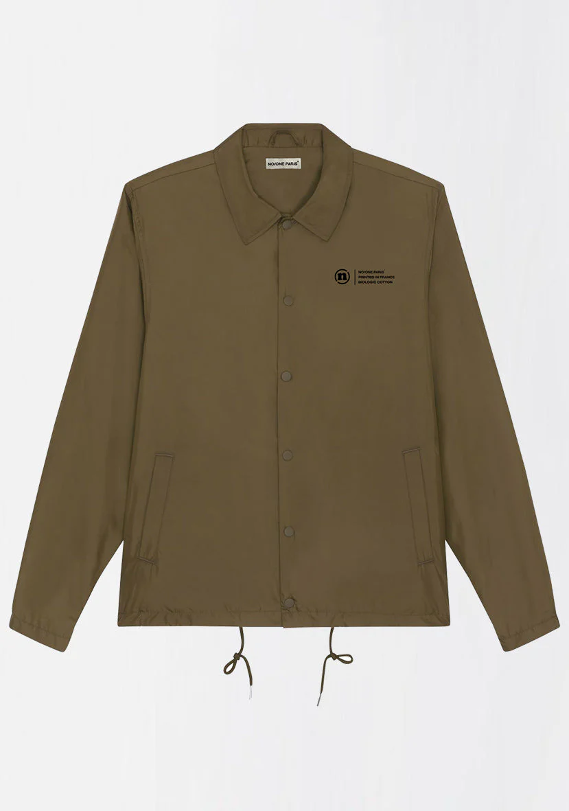 Coupe-vent unisexe kaki, en polyester recyclé avec logo « THE LABEL » noir.