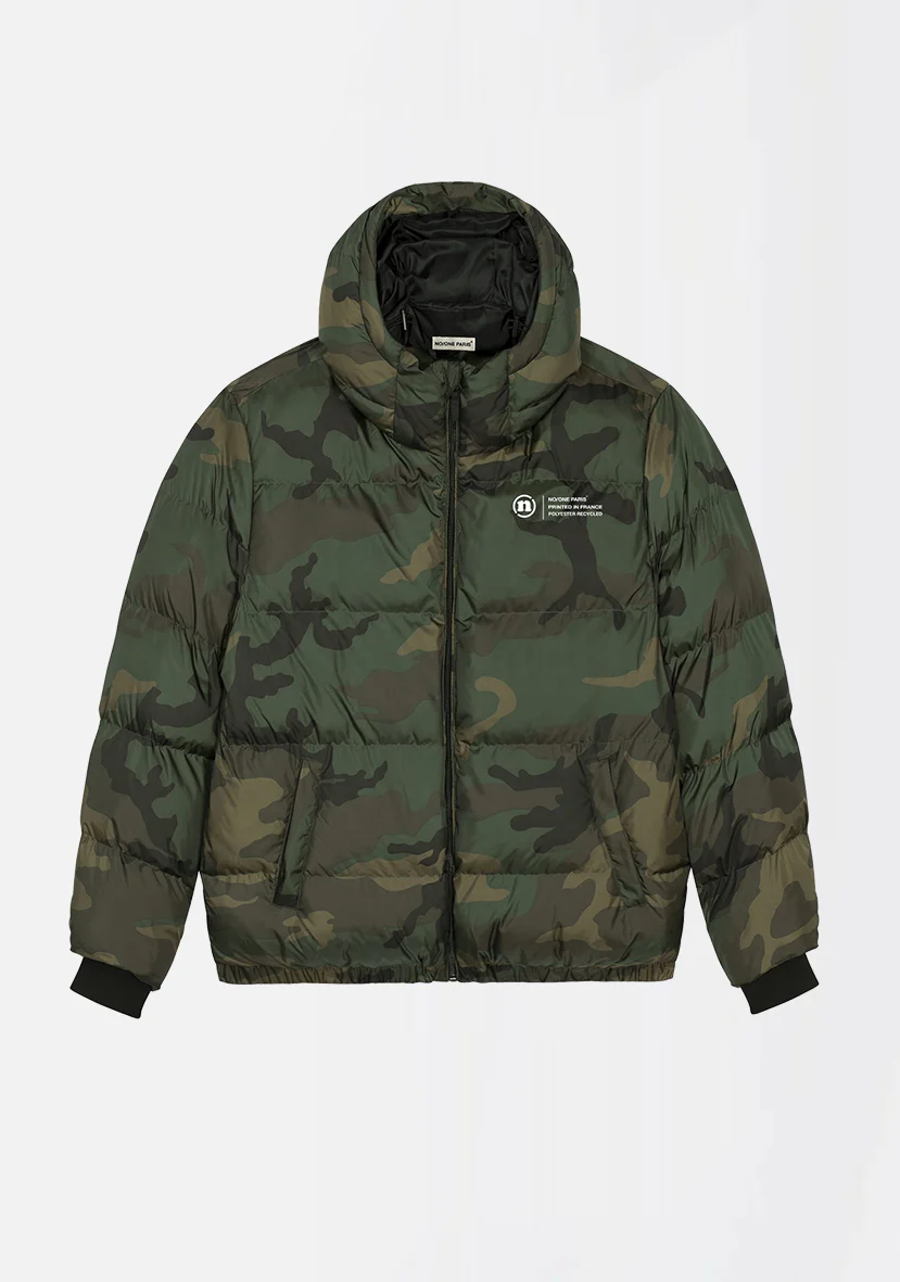 Doudoune courte unisexe camo, en polyester recyclé avec logo « THE LABEL » blanc.