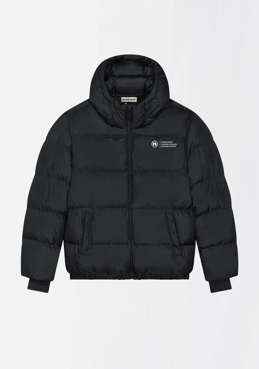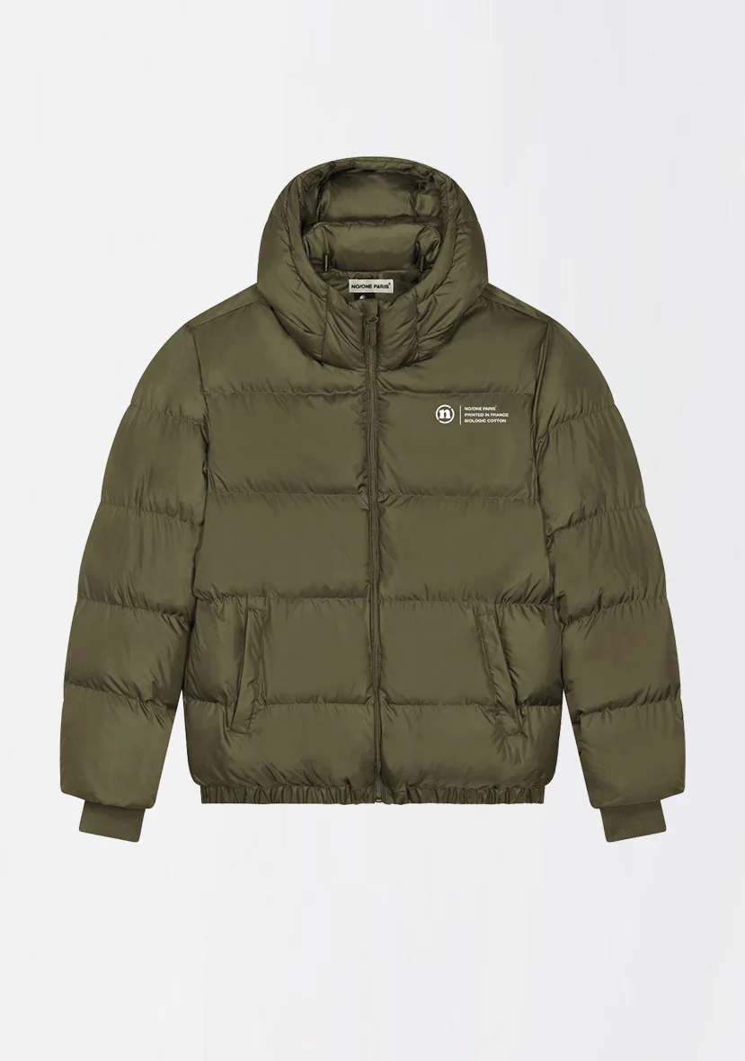 Doudoune courte unisexe kaki, en polyester recyclé avec logo « THE LABEL » blanc.