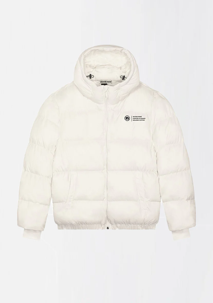 Doudoune courte unisexe noire, en polyester recyclé avec logo « THE LABEL » blanc.