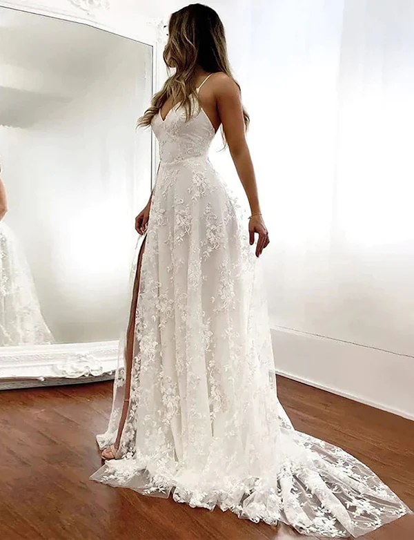 Elégante robe de mariage longue à bretelles spaghetti en dentelle