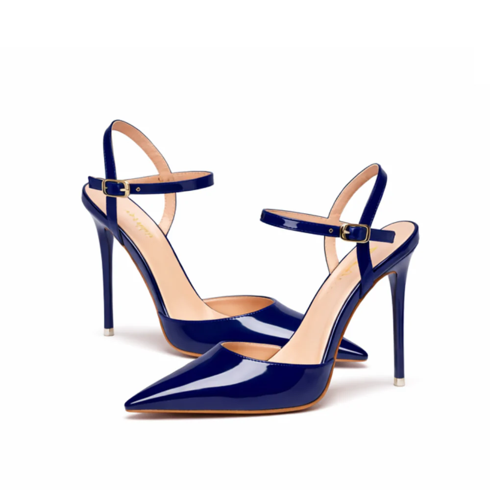 Élégants et sophistiqués, ces escarpins bleu marine vernis subliment la silhouette avec leur bout pointu, leur talon aiguille et leur bride cheville raffinée. Une paire chic, idéale pour une tenue de soirée, un événement ou un look habillé au quotidien.