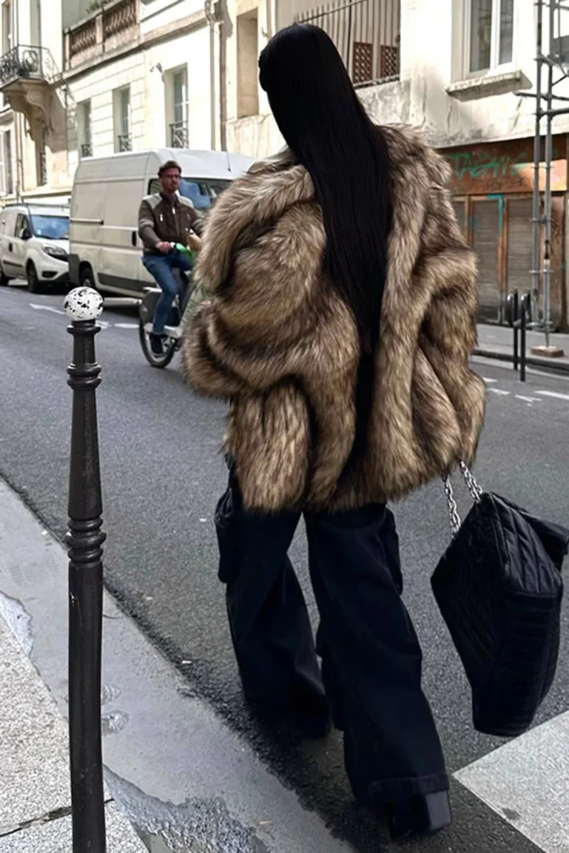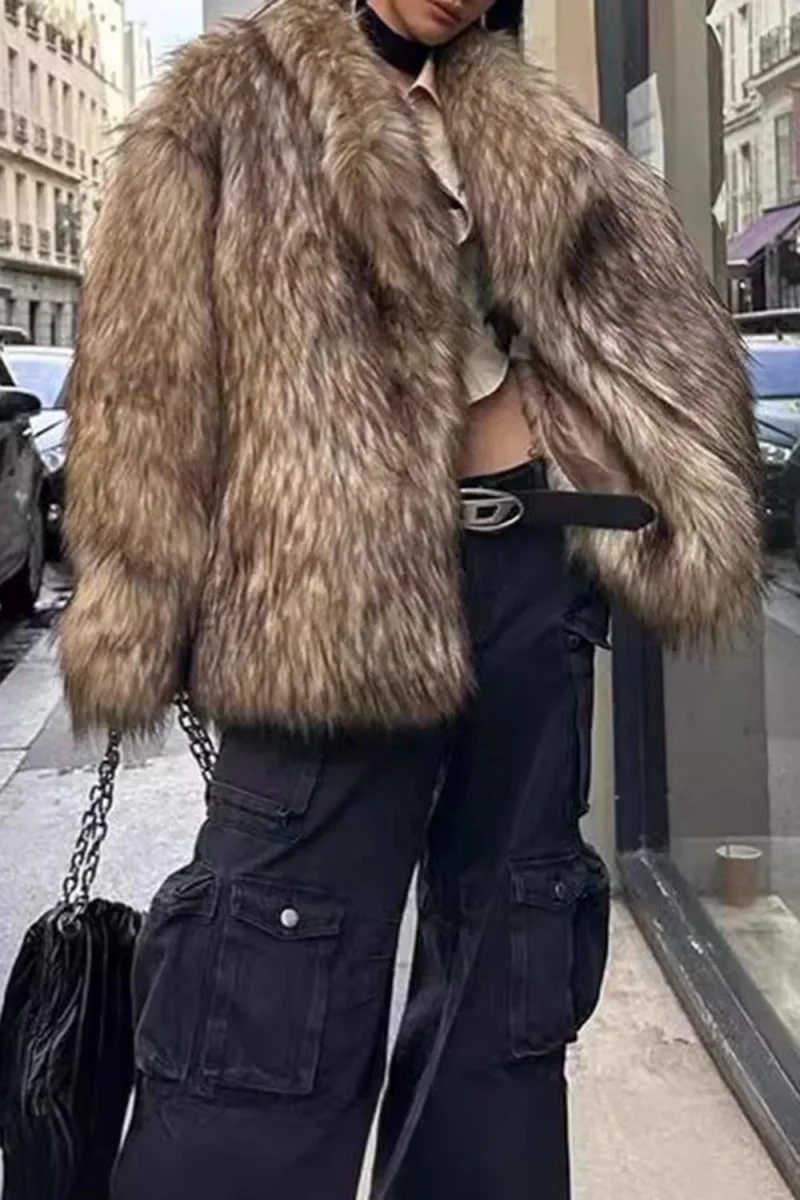 Camel revers cranté long fausse fourrure long Shaggy femmes manteau