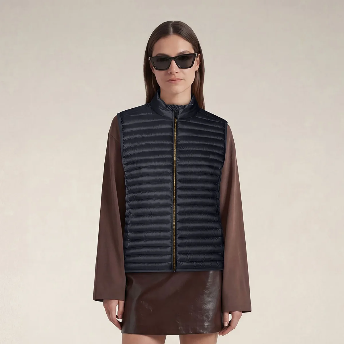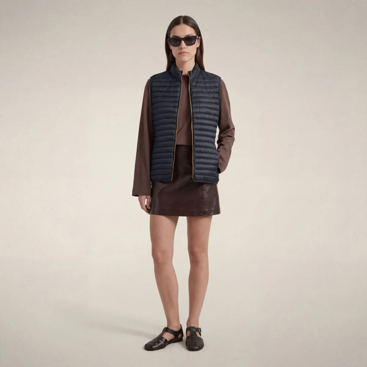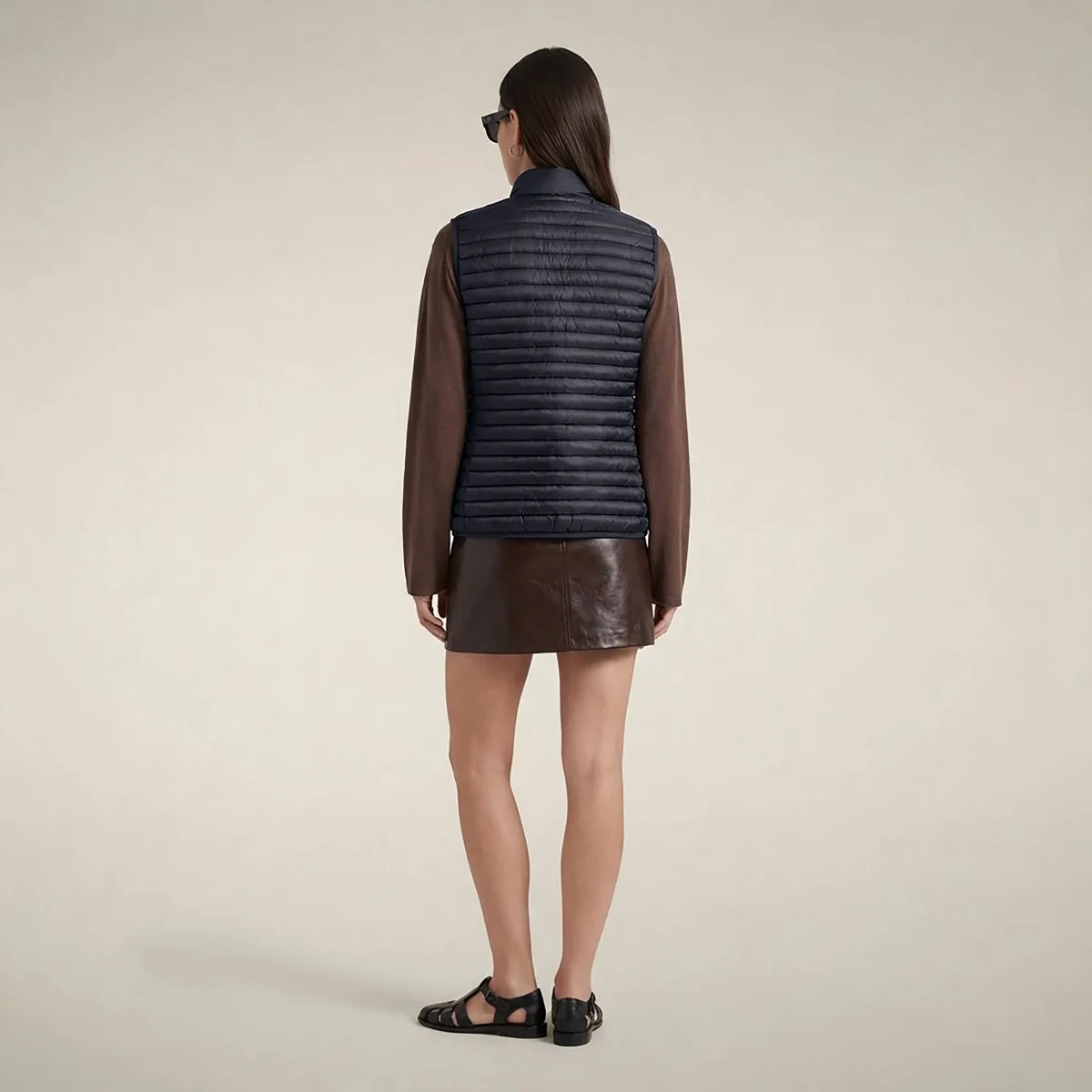 Versatile e leggero, il gilet imbottito da donna slim fit modello Arabella combina la finitura luminosa del tessuto, la trama trapuntata stretta e il colletto comodo. Rifinito in Lycra su fondo e giromanica, presenta chiusura brillante e tasche laterali zippate. Segni particolari? L’imbottitura animal-free in PLUMTECH®, i tirazip personalizzati e il piccolo logo tondo applicato sul fianco.
