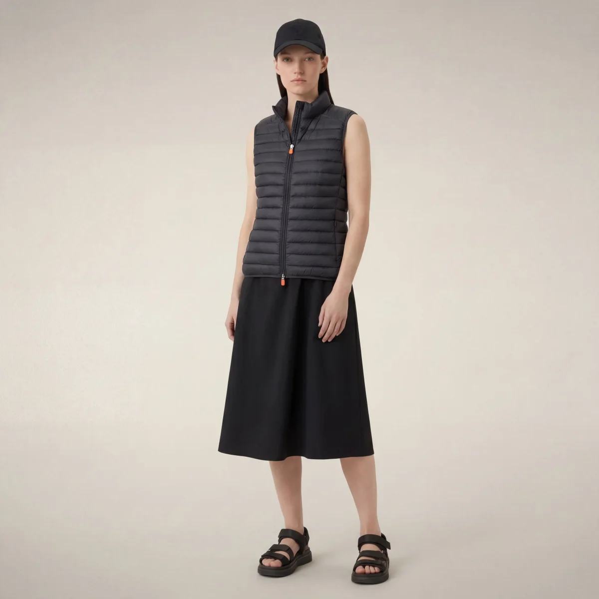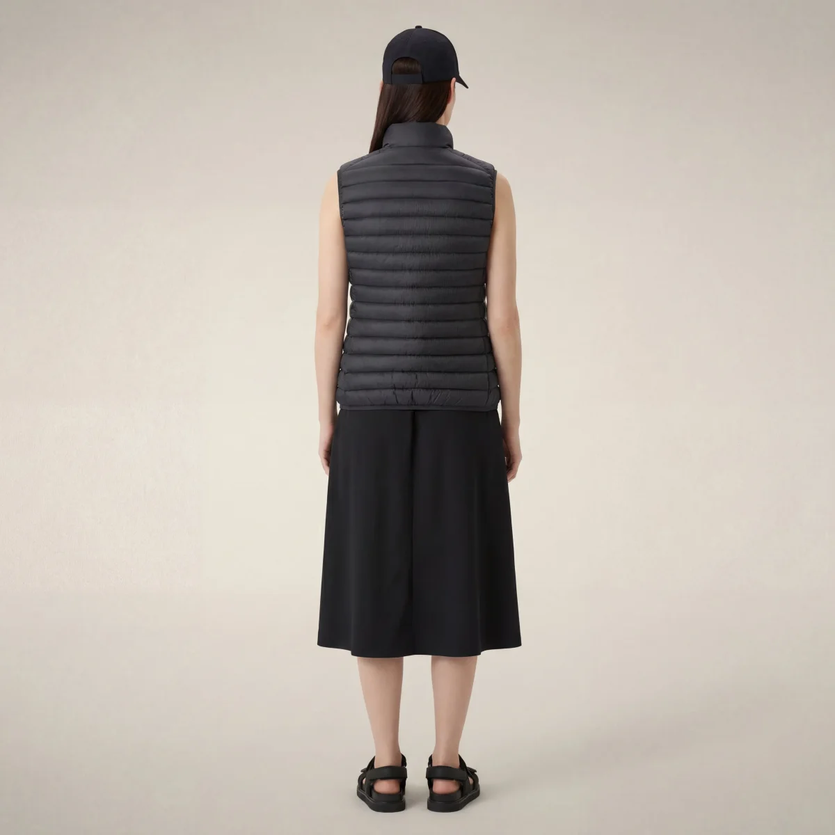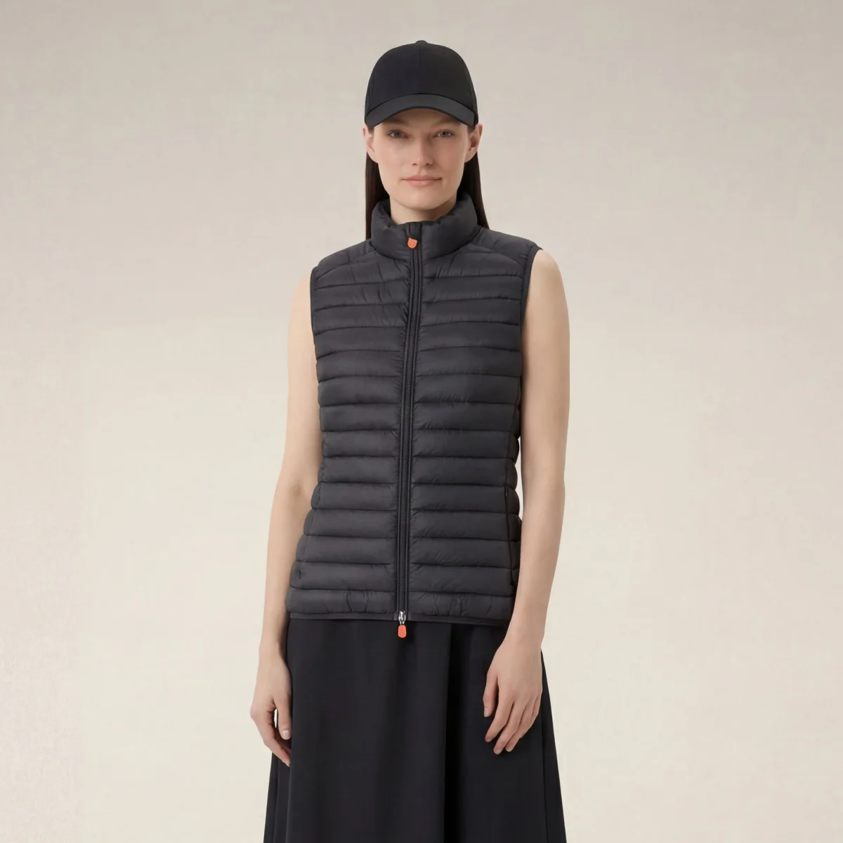 Protagonista dei look a strati, il gilet imbottito da donna modello Charlotte combina il leggero design trapuntato con il collo alto. Rifinito in Lycra su fondo e giromanica, lo smanicato slim-fit presenta chiusura a doppio cursore e tasche laterali zippate. Segni particolari? I tiretti personalizzati arancioni, il logo rotondo e l’imbottitura animal free in Plumtech®.