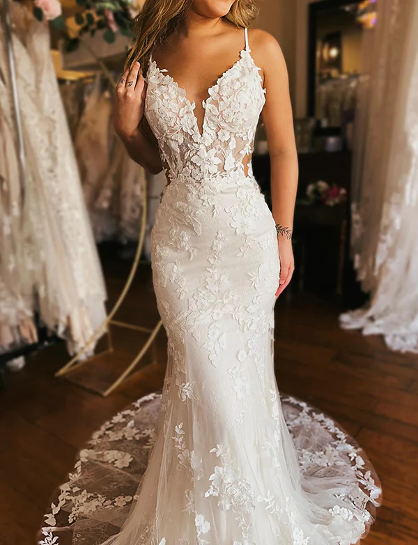 Ivoire Robe de mariée de plain-pied en fourreau sirène avec appliques magnifiques