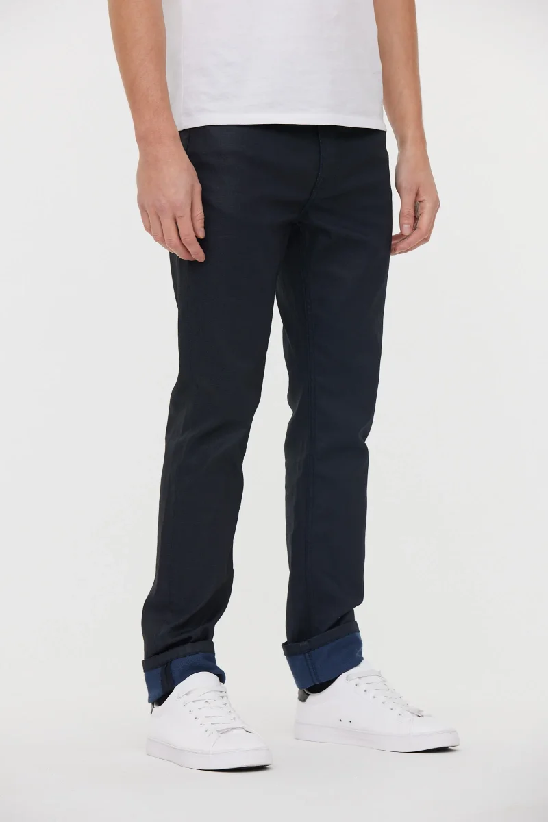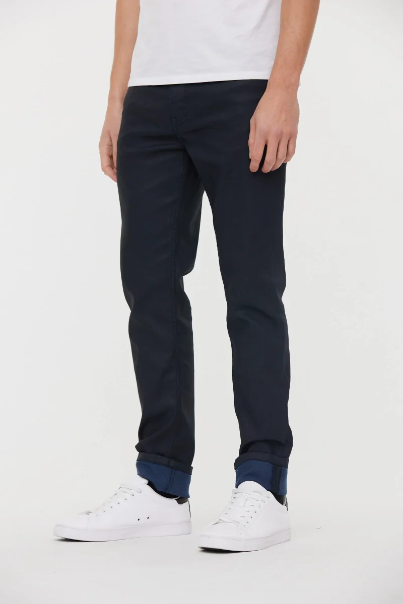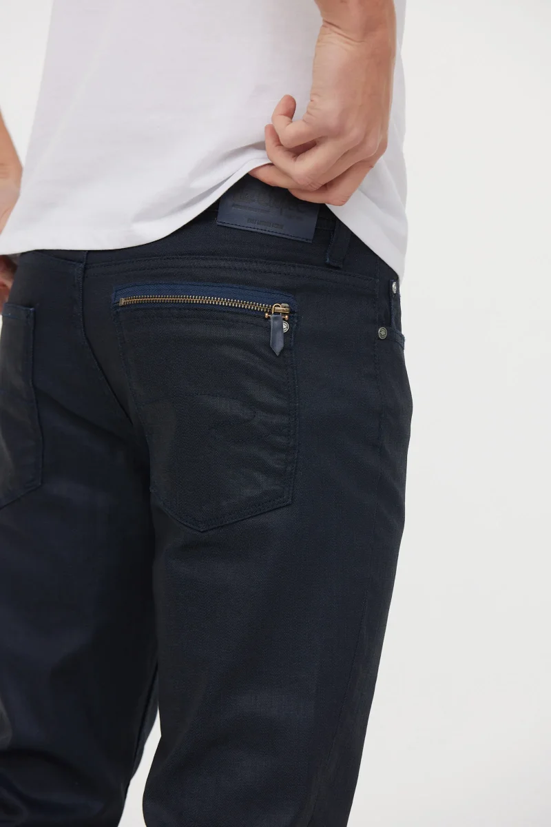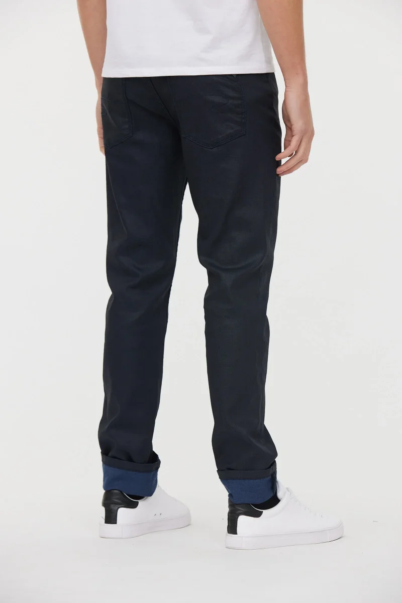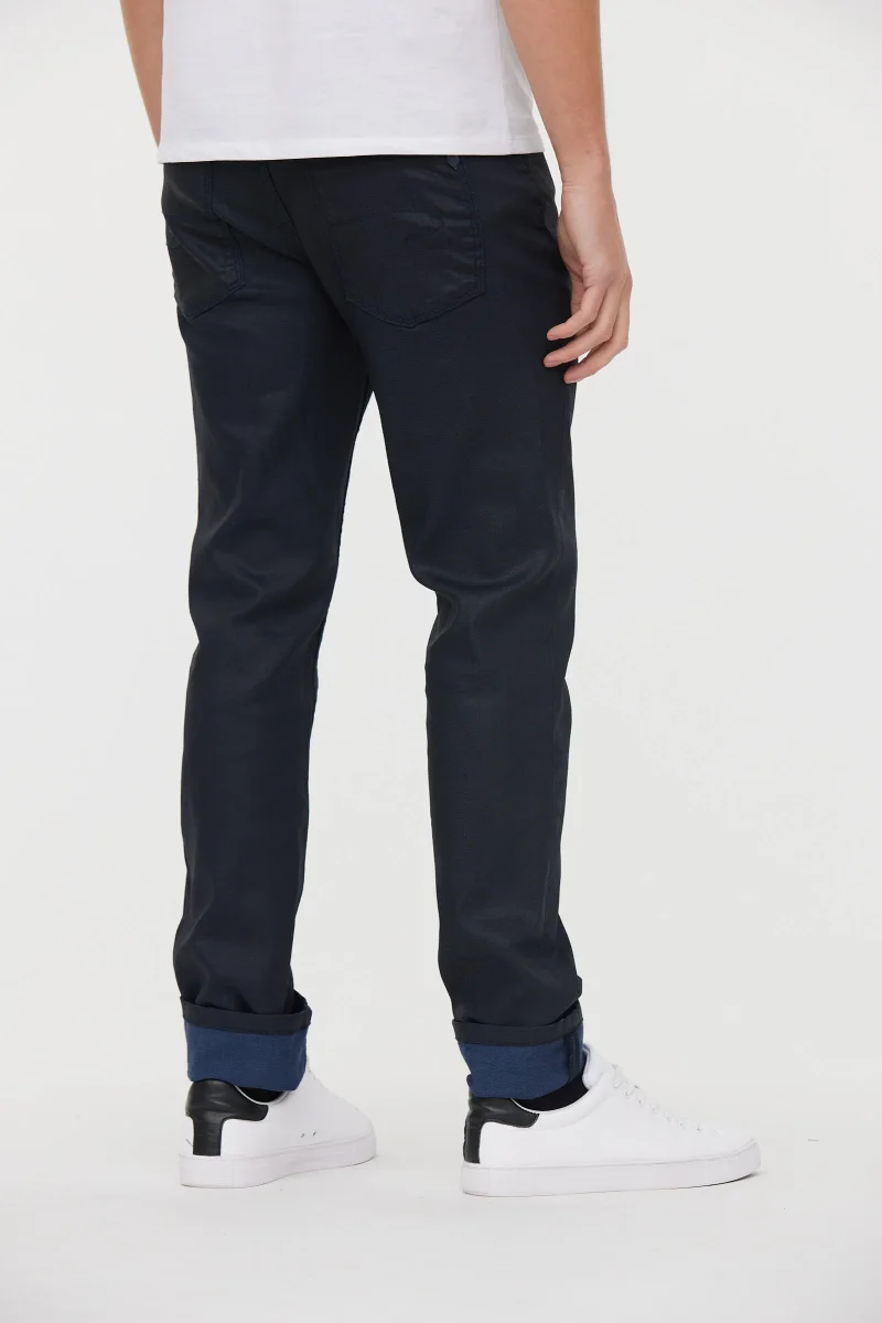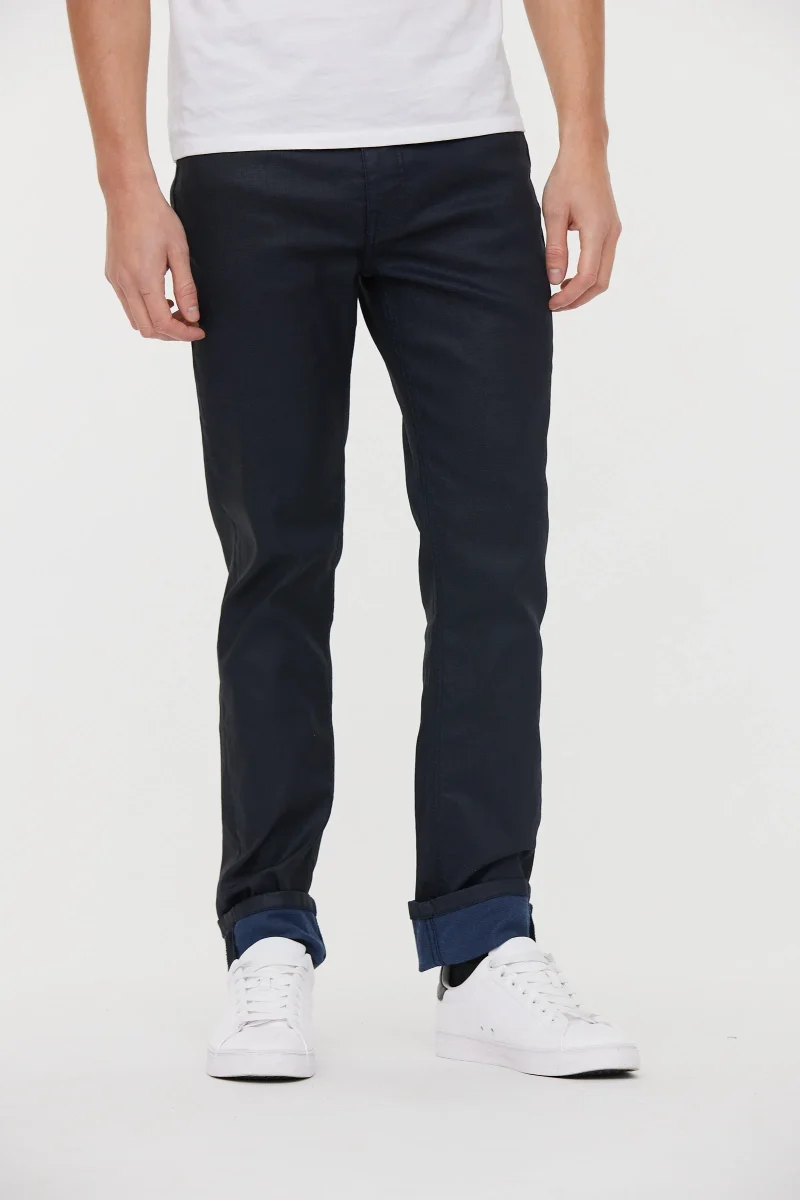 jean coupe straight, taille medium, jambe ajustée en matiere enduite Le mannequin mesure 1.85 cm et porte la taille 31