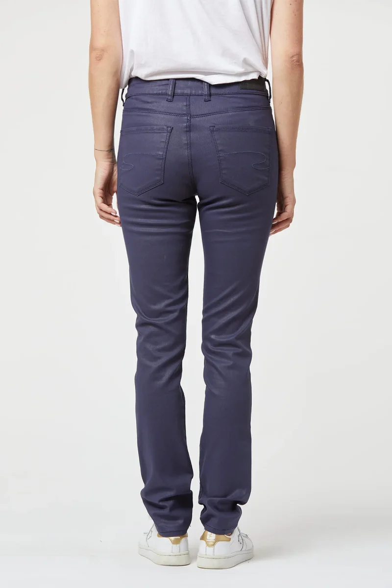 Jean LC135 navy coatted, Slim fit, coupe ajustée, taille medium haut, longueur 32, 5 poches, fermeture zippée. Le mannequin mesure 173 cm et porte une taille 26.Jambe ajustéeBas de jambe: 15cm