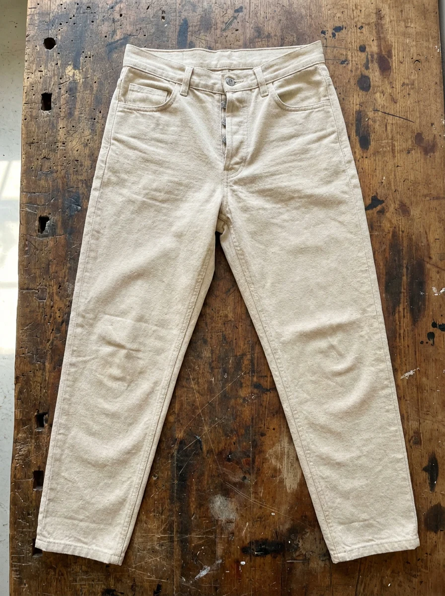 Jean seconde main en denim 100 % lin. Légères marques d’usage naturelles, sans défaut visible. La toile est souple et la coupe conserve toute sa tenue.