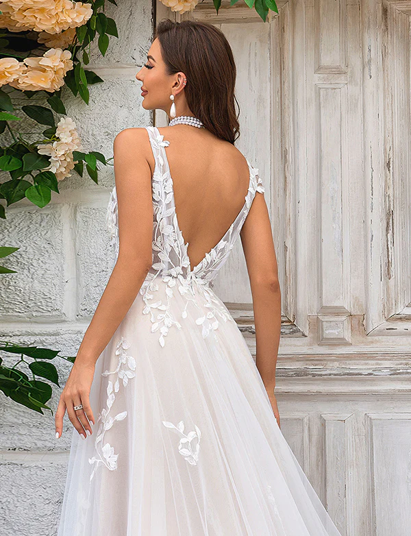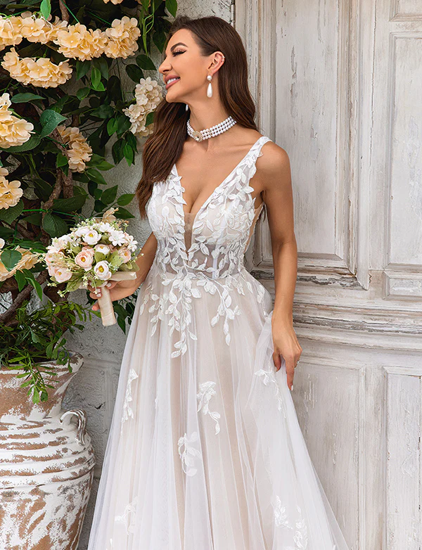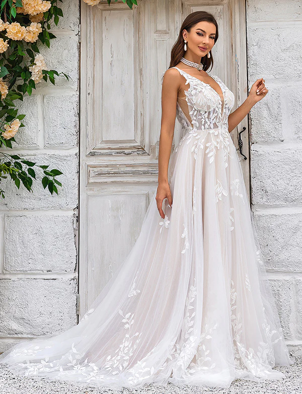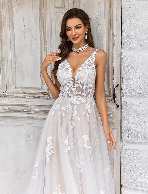 Magnifique robe de mariée en tulle champagne à encolure en V profonde et dentelle