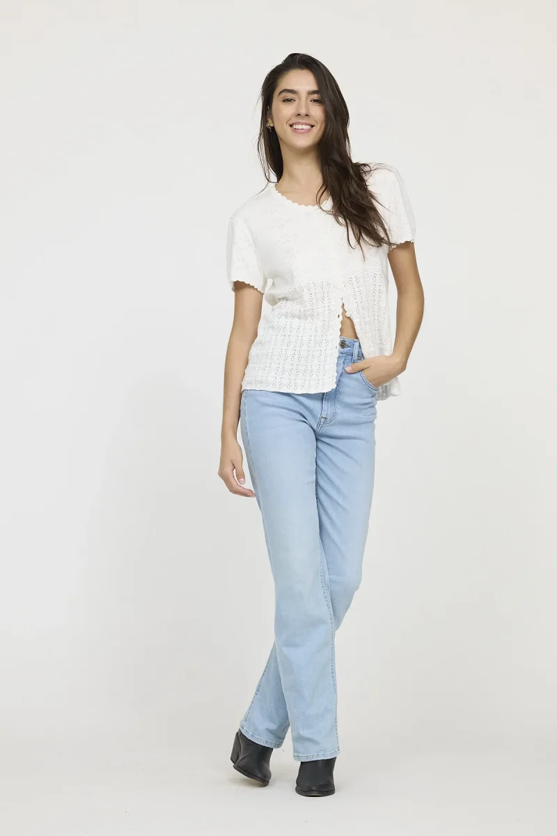 Cardigan femme en maille ajourée allie confort et style dans une pièce à la fois chic et décontractée. Le mannequin mesure 1m75 et porte la taille S