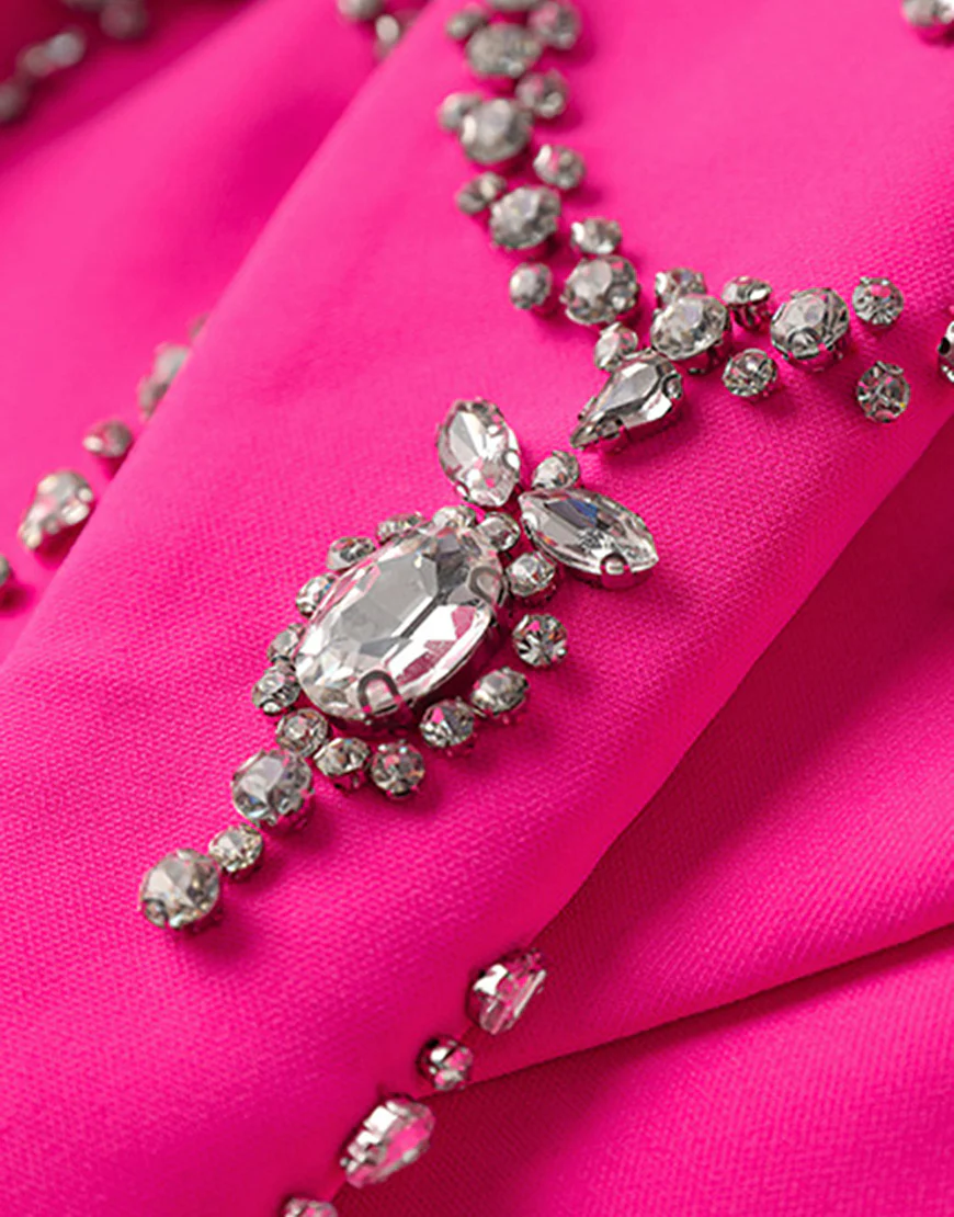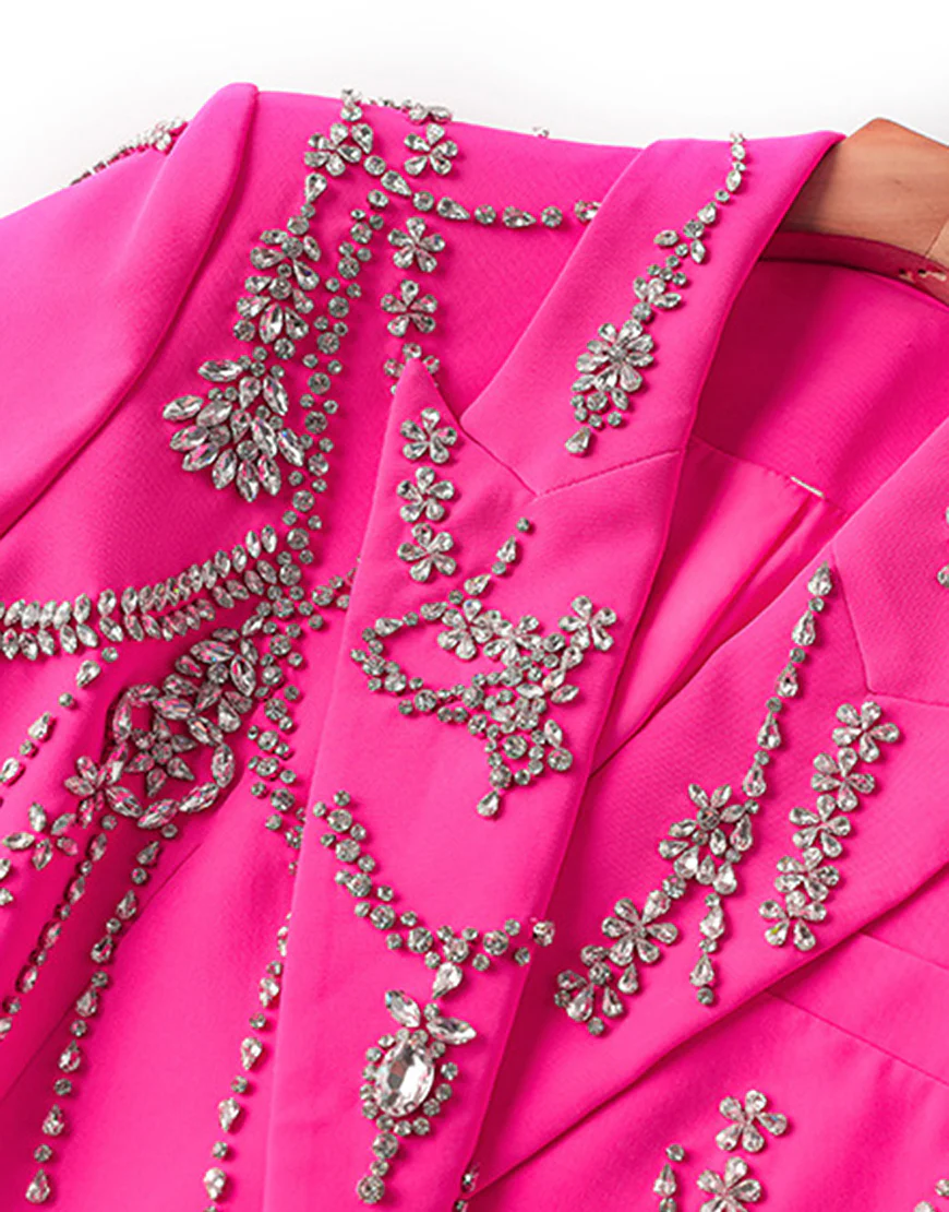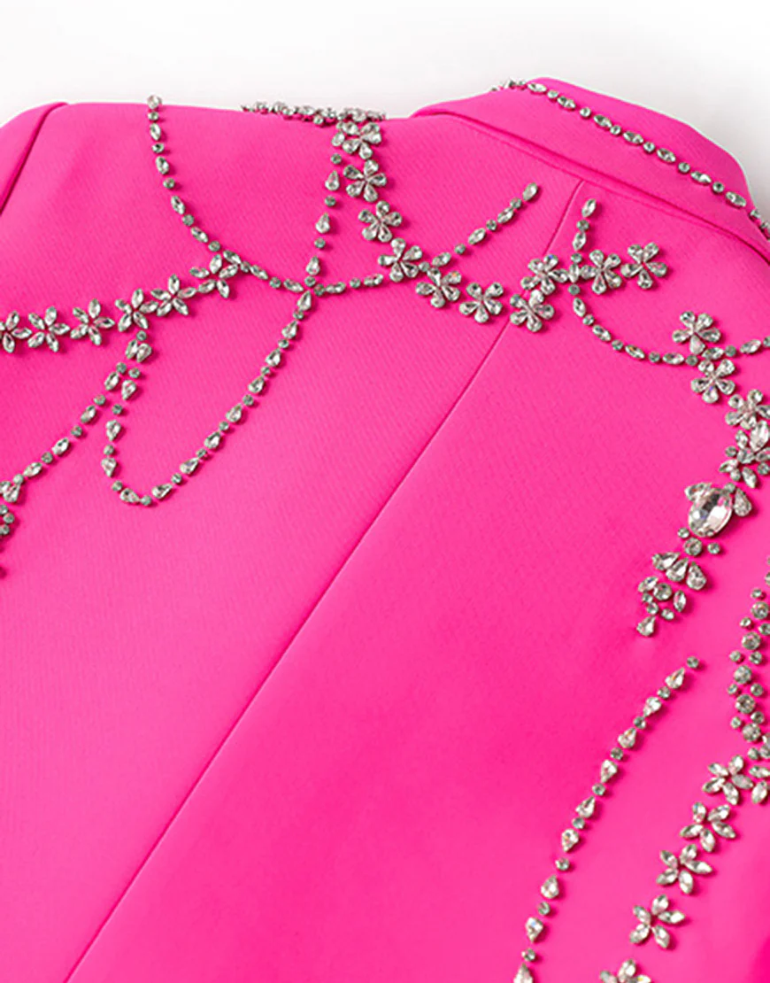 Manteau double-breasted pour femmes avec revers en pointe fuchsia et décor de cristaux