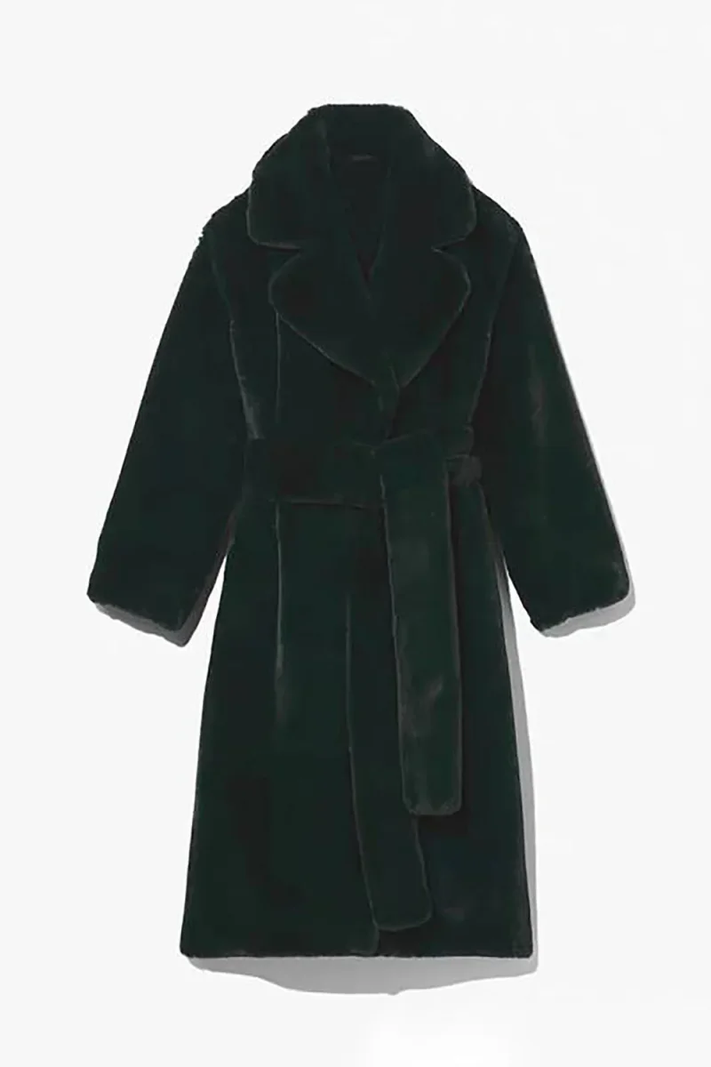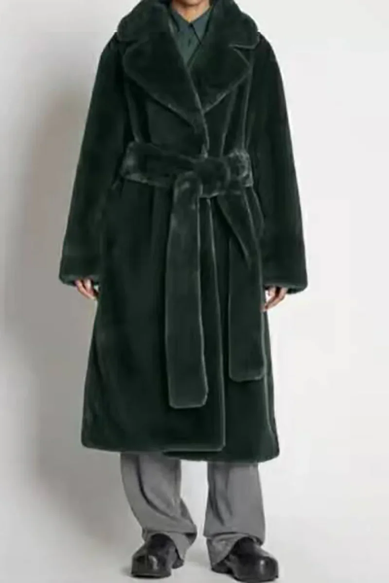Manteau long ouvert en peau de mouton en fausse fourrure kaki avec ceinture