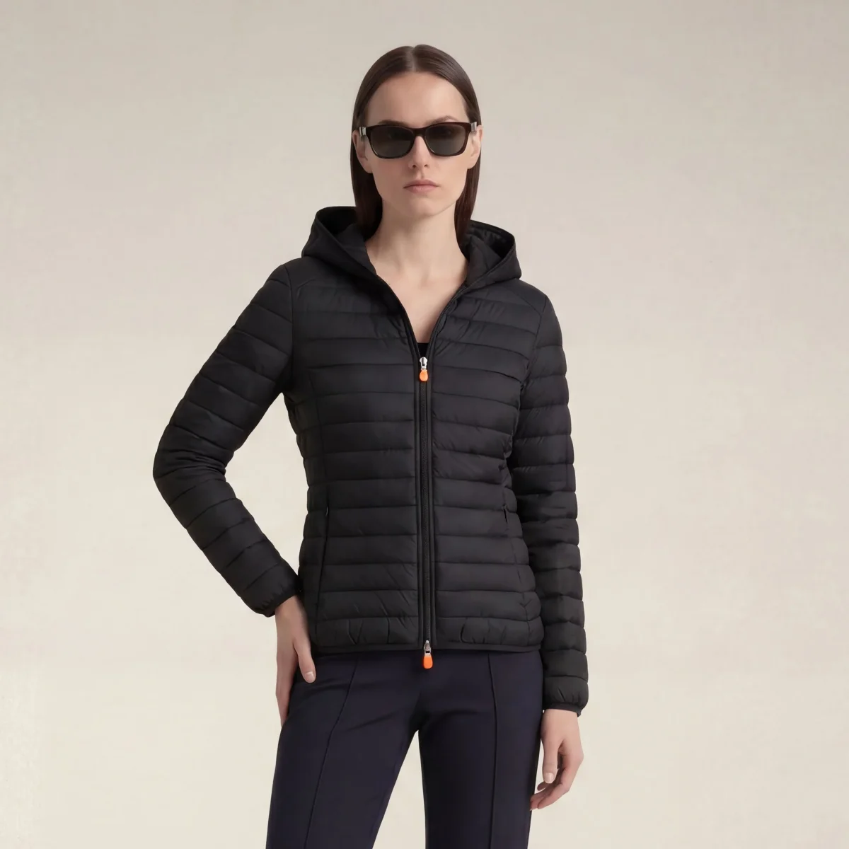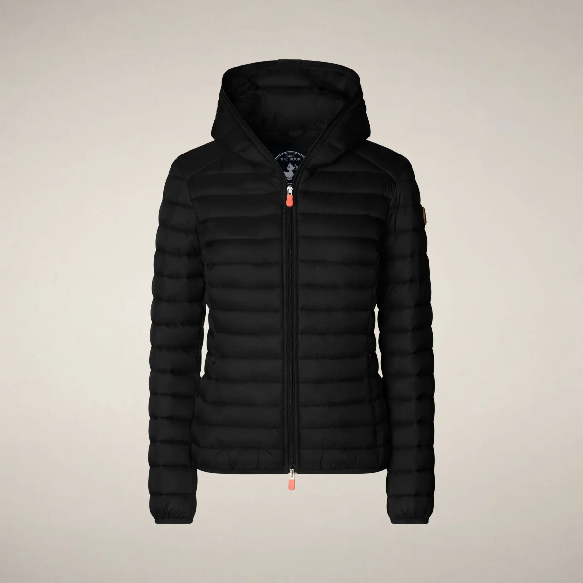 Bestseller dello stile Save The Duck, il piumino animal-free da donna modello Daisy unisce il leggero design in nylon con la morbida imbottitura in PLUMTECH®. Completo di cappuccio, chiusura a doppio cursore e tasche laterali con zip nascoste, è rifinito da polsi e fondo elasticizzati. Il capo si distingue per il tirazip personalizzato e il logo tondo sulla manica sinistra arancioni. Tutto il comfort di un piumino 100 grammi, in una versione 100% animal-free.