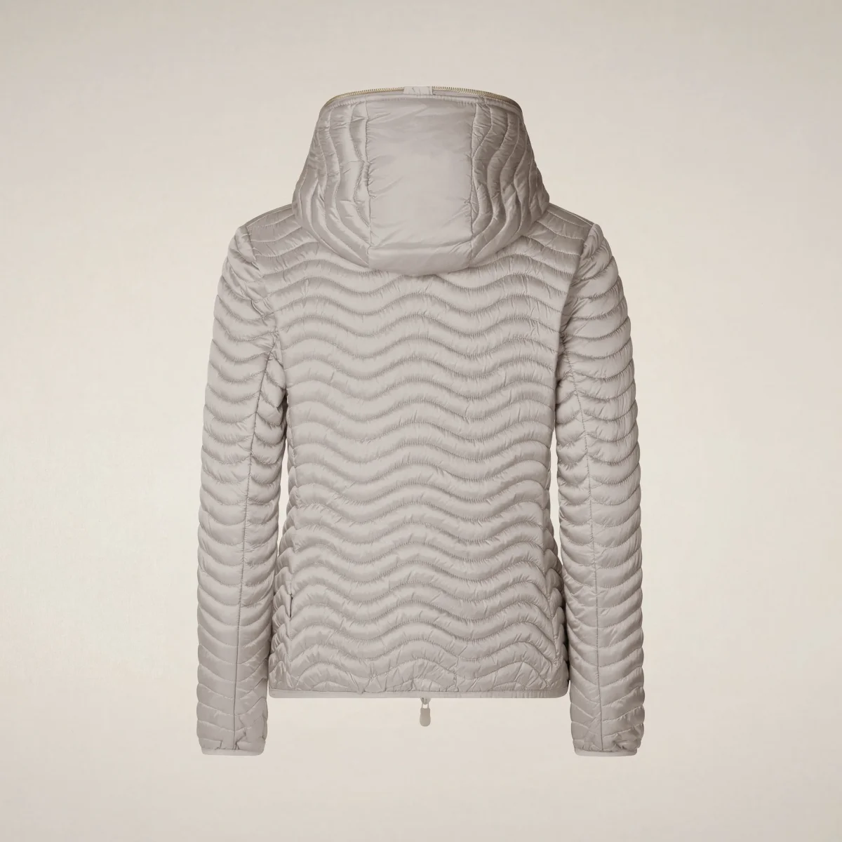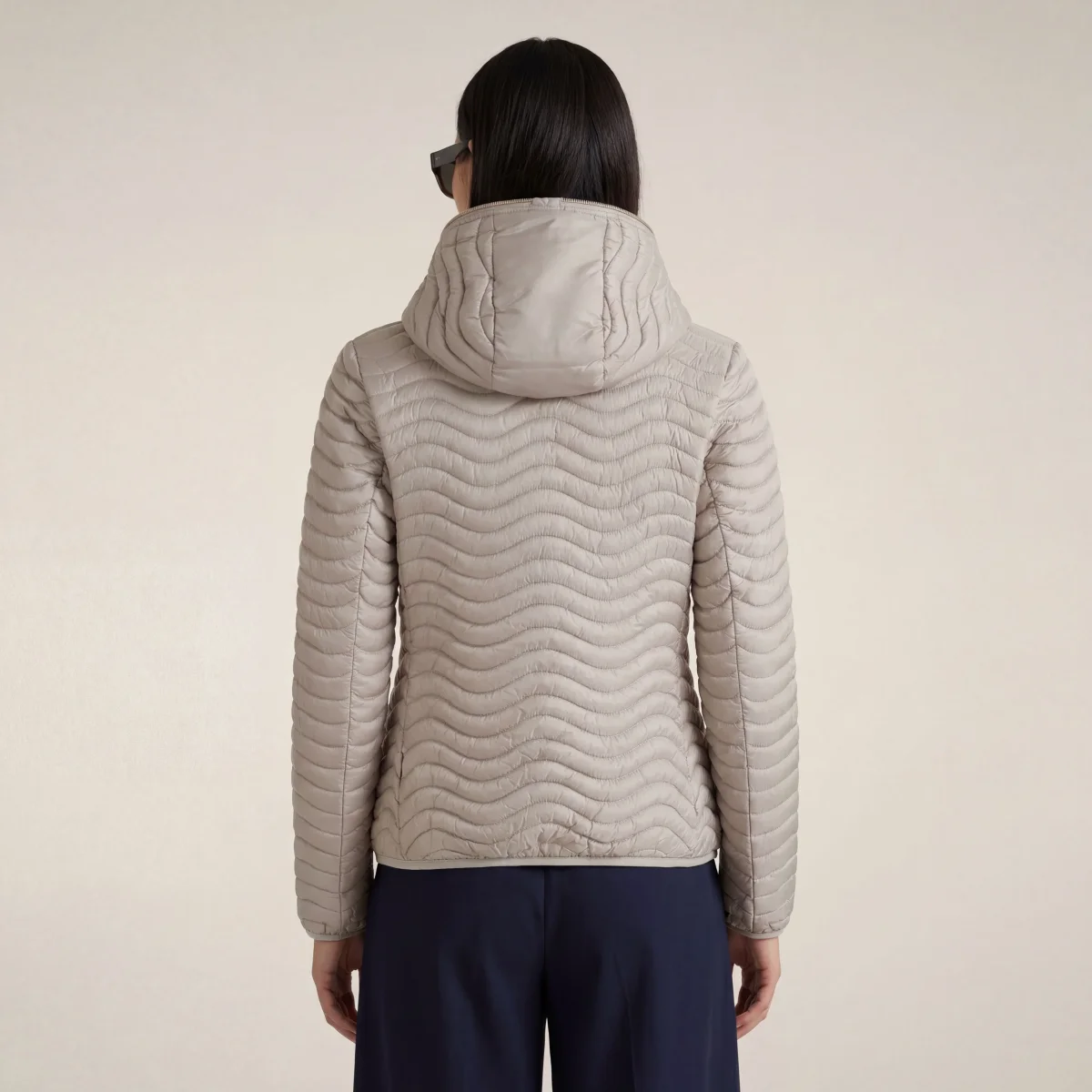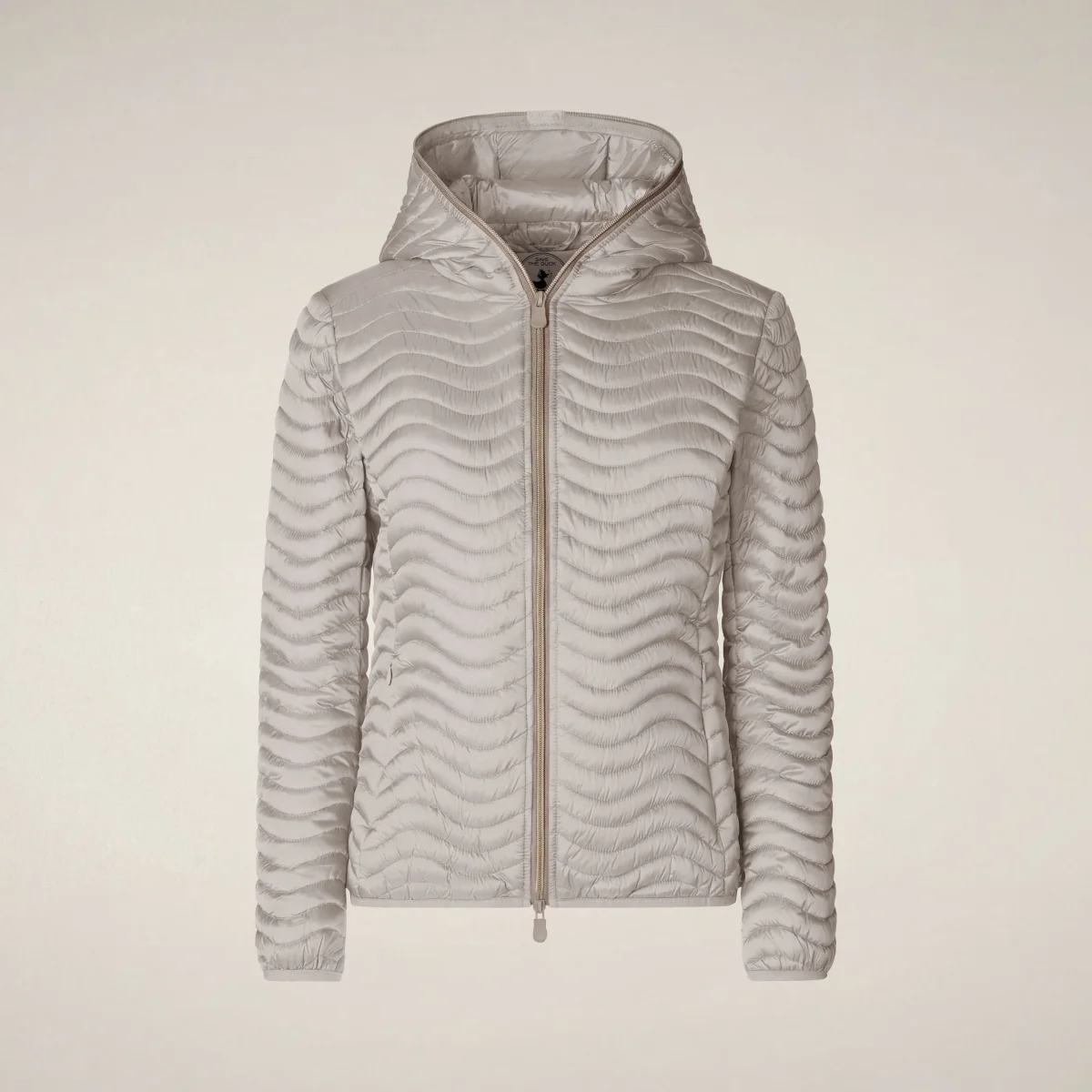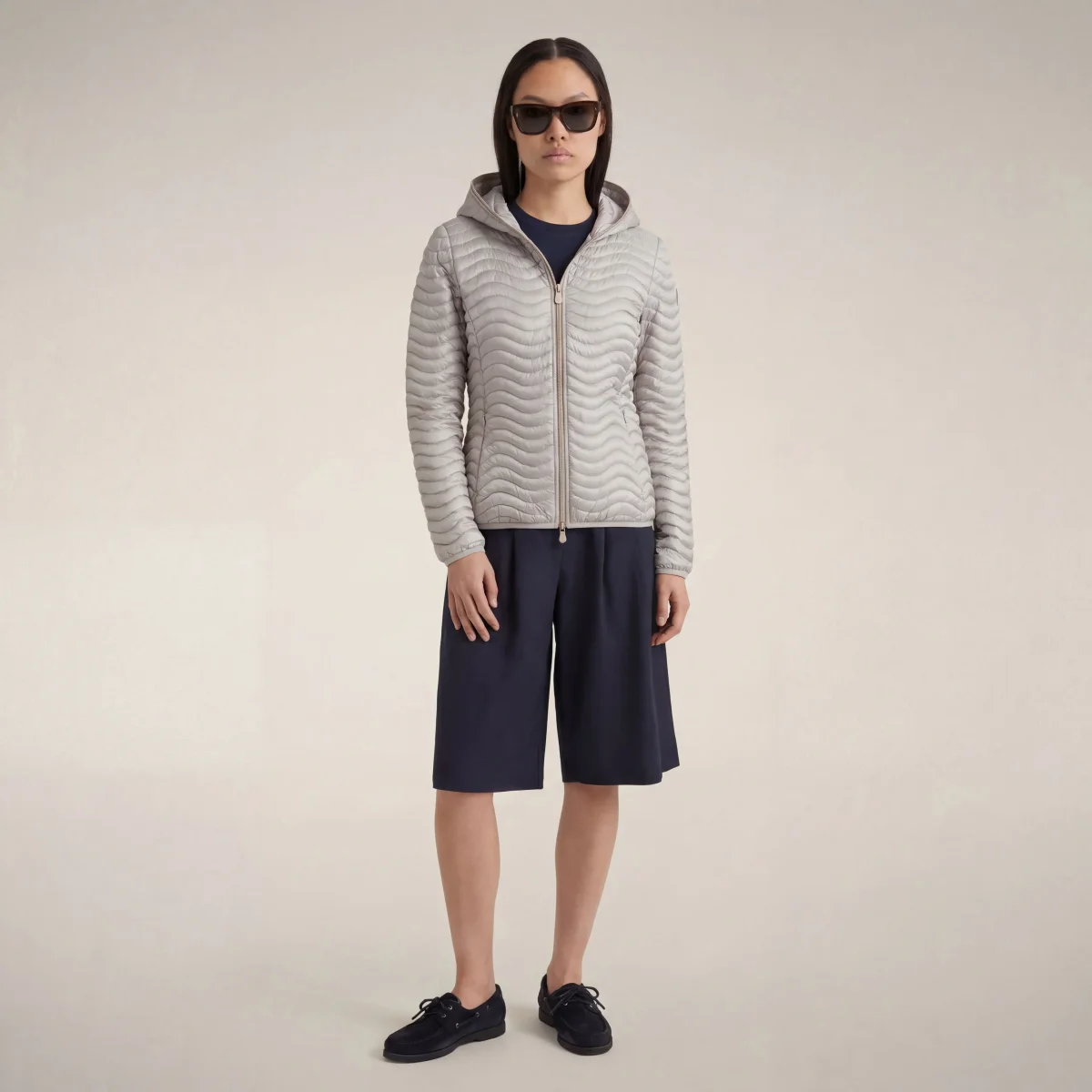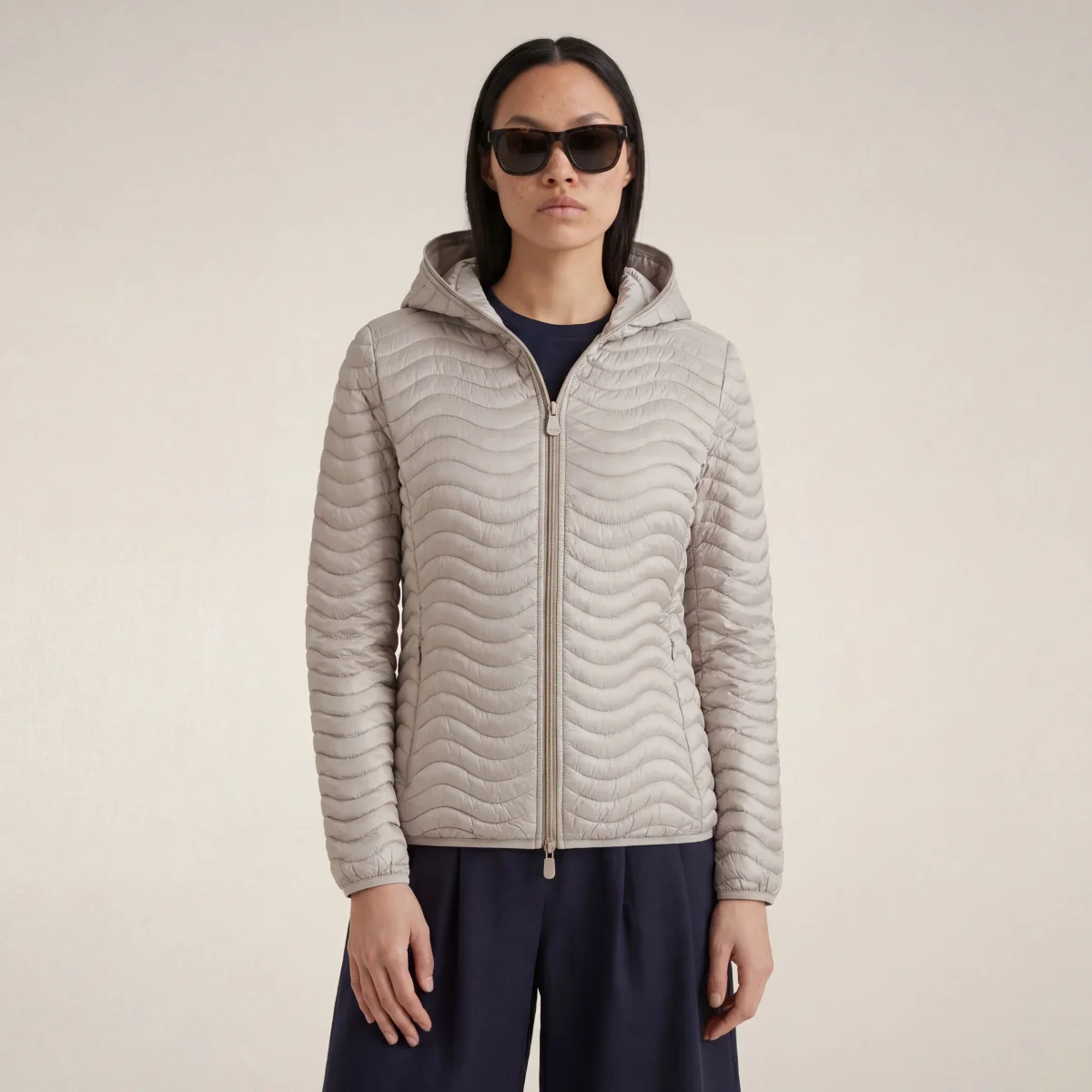 Il piumino con cappuccio donna modello Melody reinterpreta un classico Save The Duck con un’originale trapunta ondulata. Comodo e leggero, presenta zip centrale a doppio cursore e tasche laterali con zip invisibili. Il badge rotondo sulla manica e i tiretti personalizzati completano il capo con una nota distintiva.