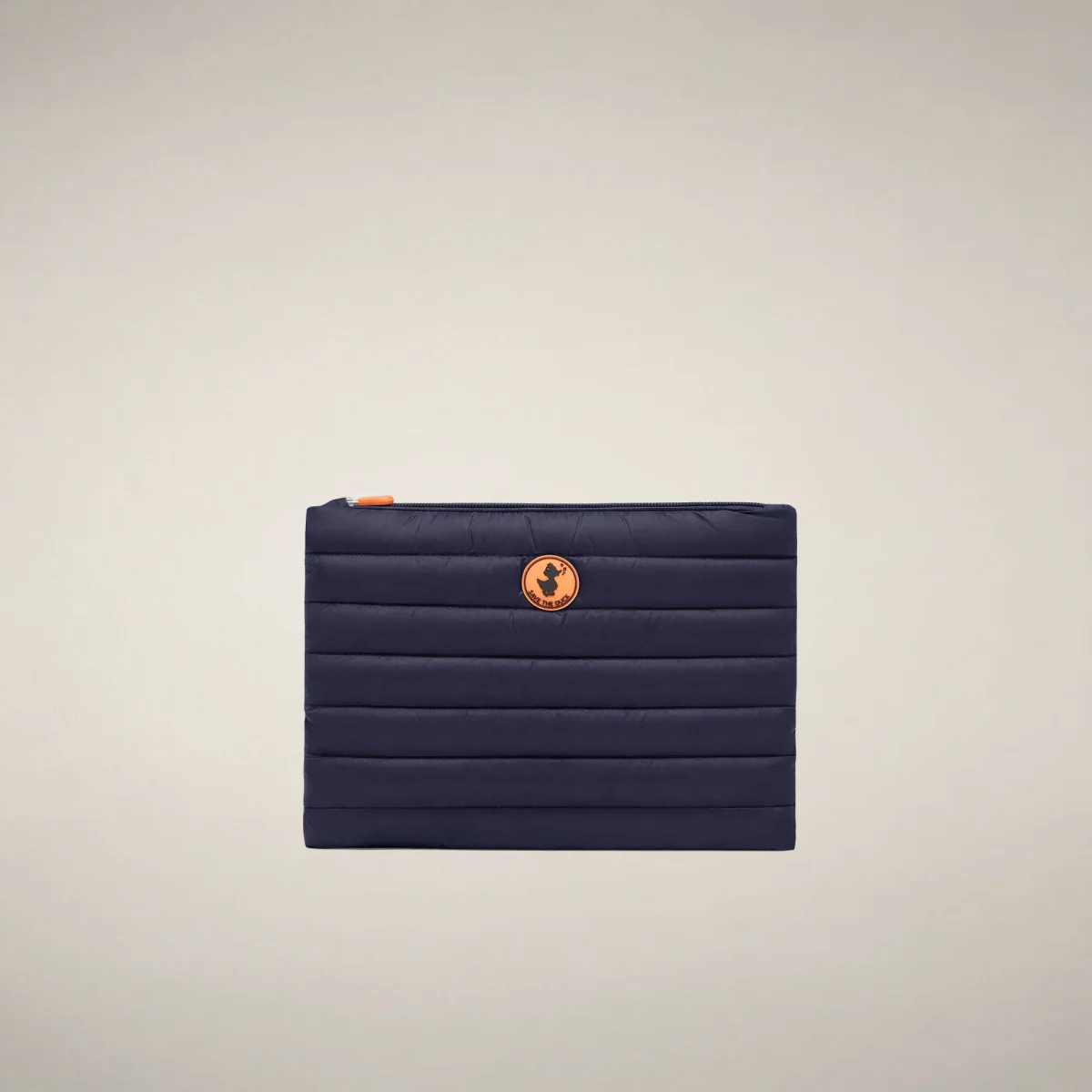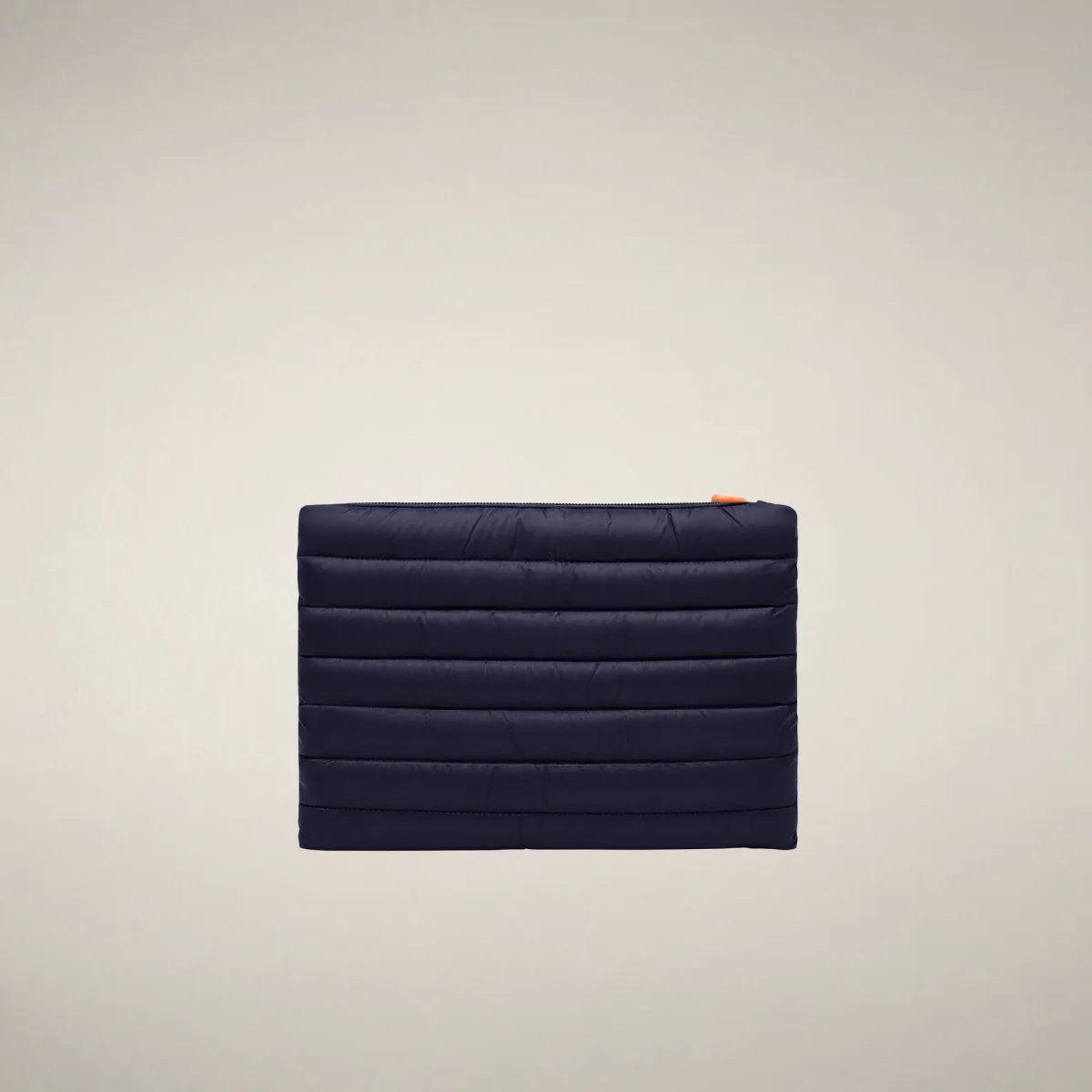 Completa il tuo stile animal free con la pouch trapuntata unisex modello Shaula. Chiusa da una zip con tiretto personalizzato, la pochette è pensata per tenere al sicuro oggetti quotidiani come chiavi, smartphone o piccoli documenti. Il logo rotondo e il design imbottito sono ispirati ai nostri piumini più iconici.