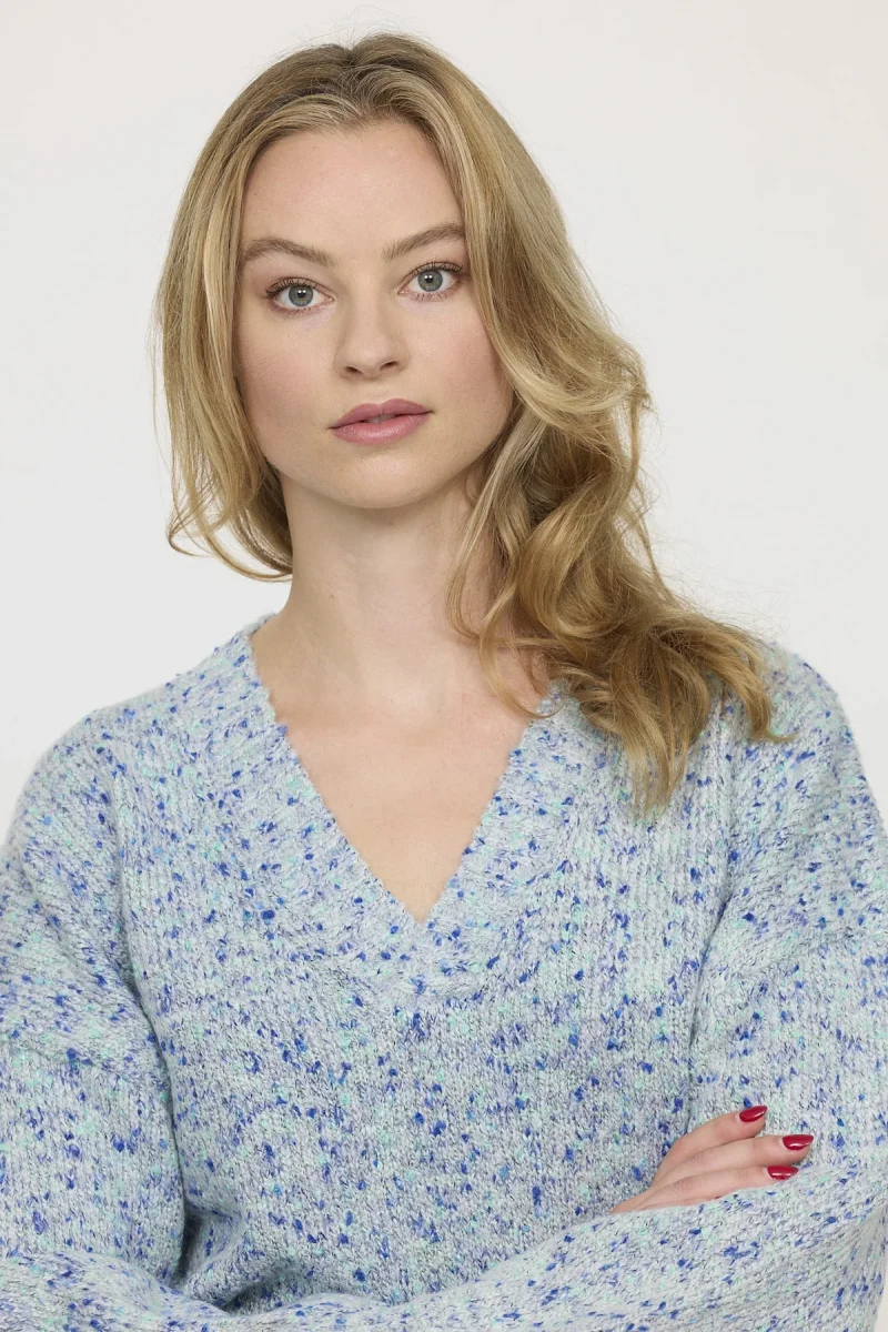 Pull en maille pour femme, doté d’un col en V. Conçu pour allier style raffiné et douceur. Bords côtelés aux poignets et à l’ourlet pour une meilleure tenue et une allure soignée.