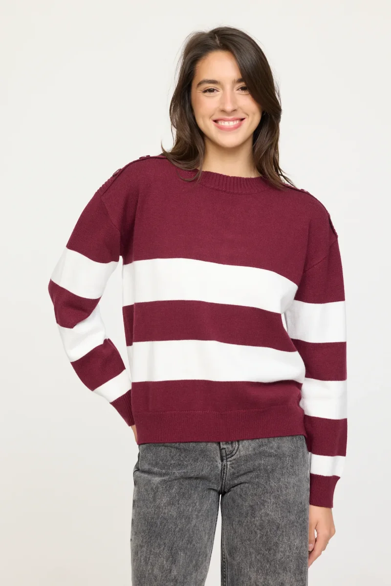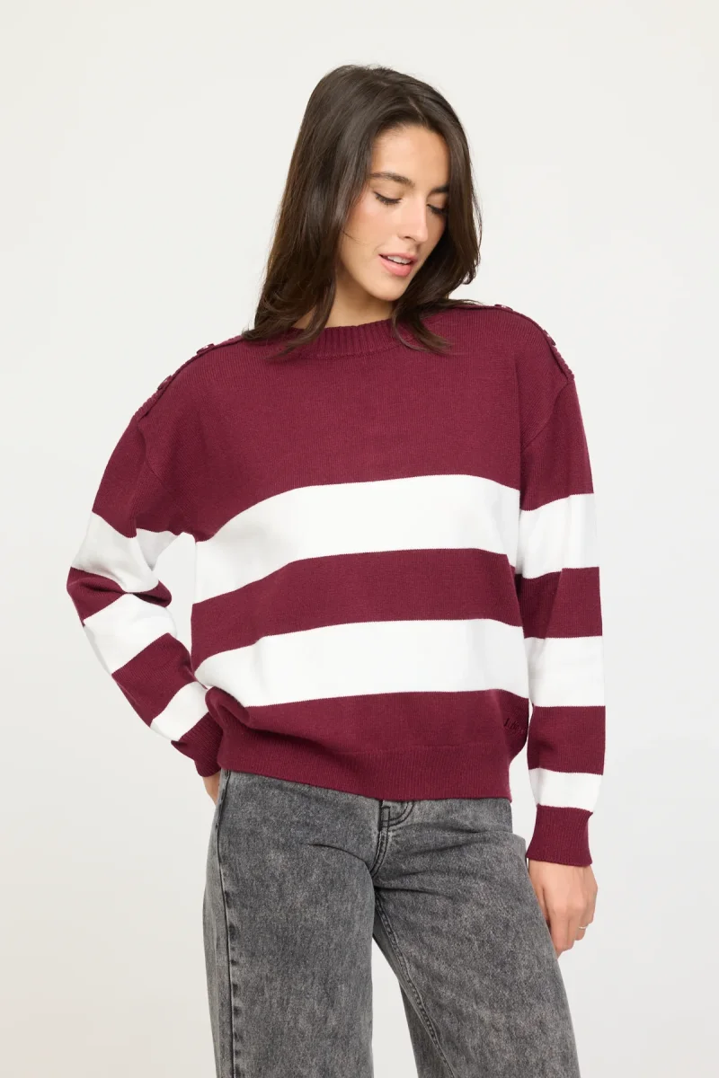 Doté d’un col rond, de manches longues et d’une coupe féminine ajustée, il se distingue par ses deux larges rayures contrastantes positionnées sur le buste et les manches, pour un effet graphique affirmé. Le détail signature? Une rangée de faux boutons décoratifs courant le long de chaque épaule, ajoutant une touche sophistiquée à ce basique revisité.