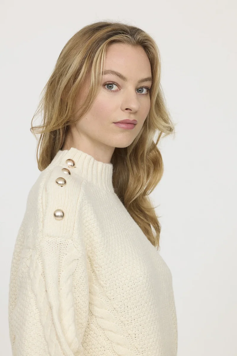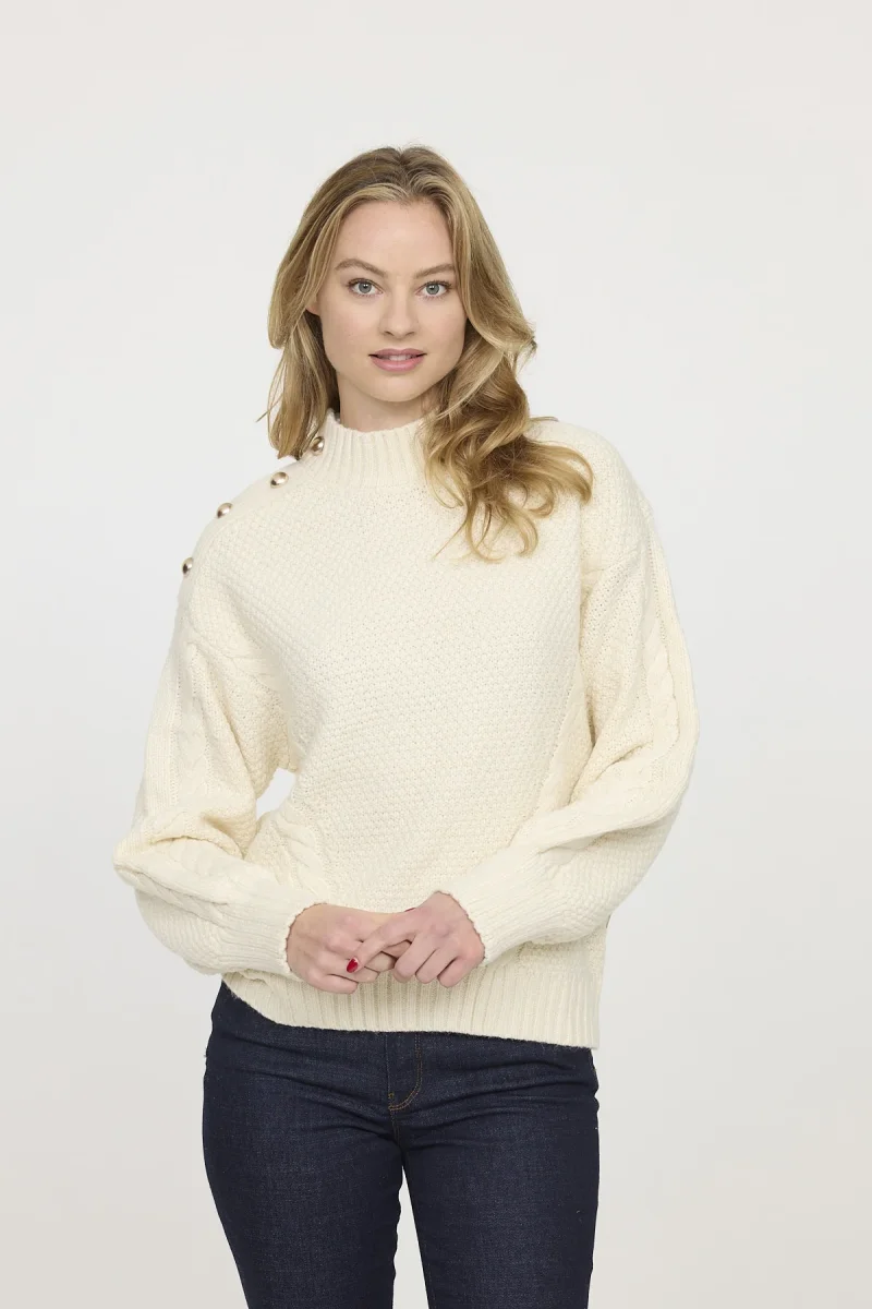 Pull en maille col rond confortable et stylé avec ornement sur l’épaule droite, assurant une protection supplémentaire contre le froid et une allure élégante. Le mannequin mesure 1m70 et porte la taille S