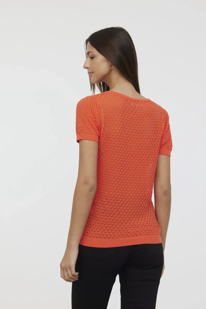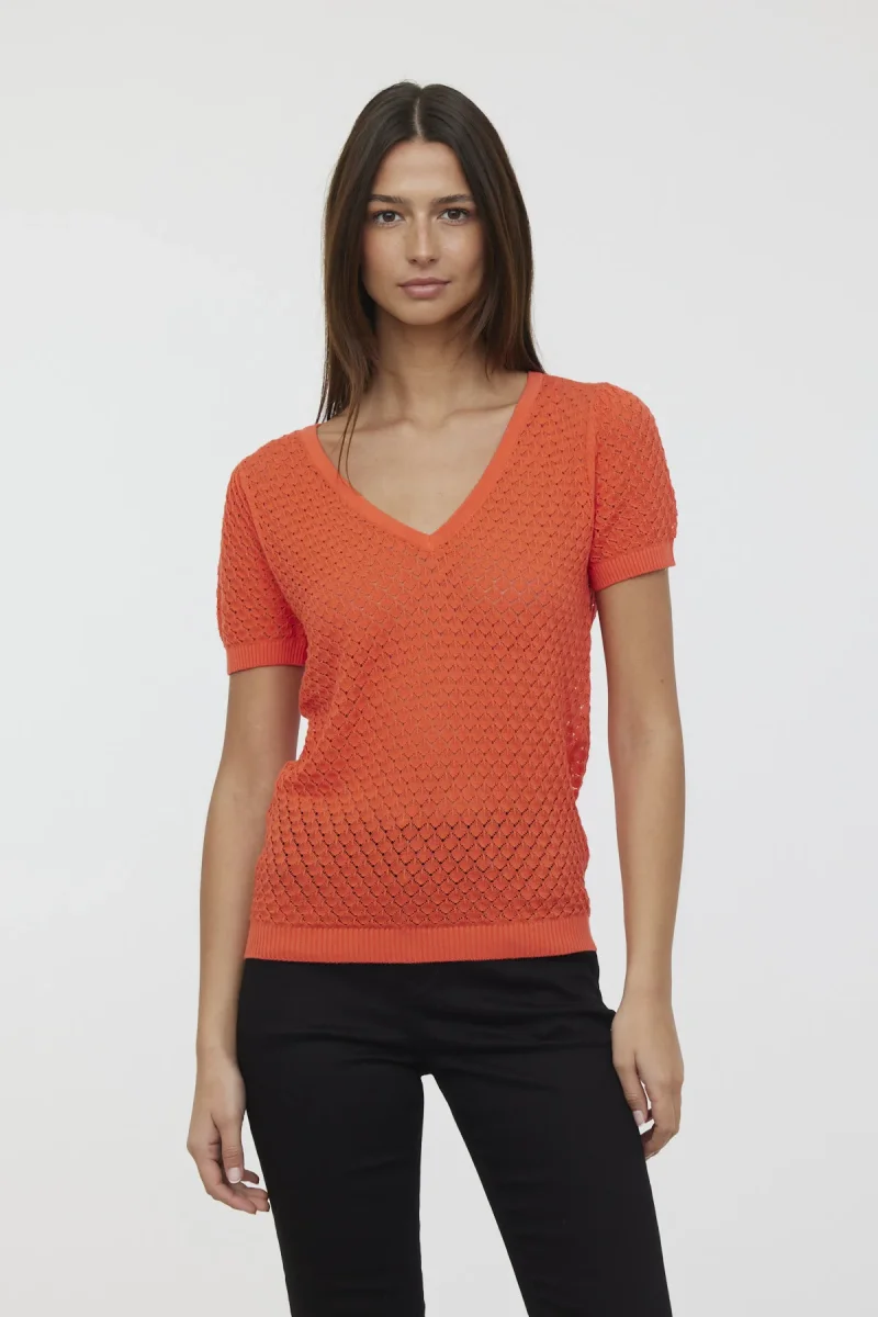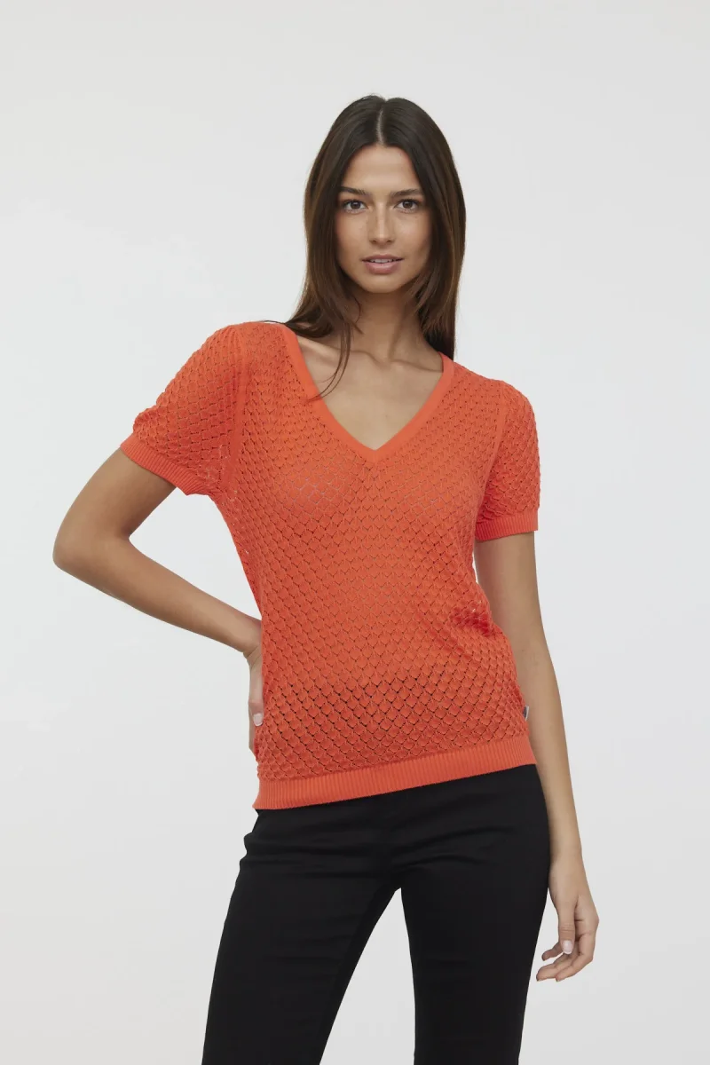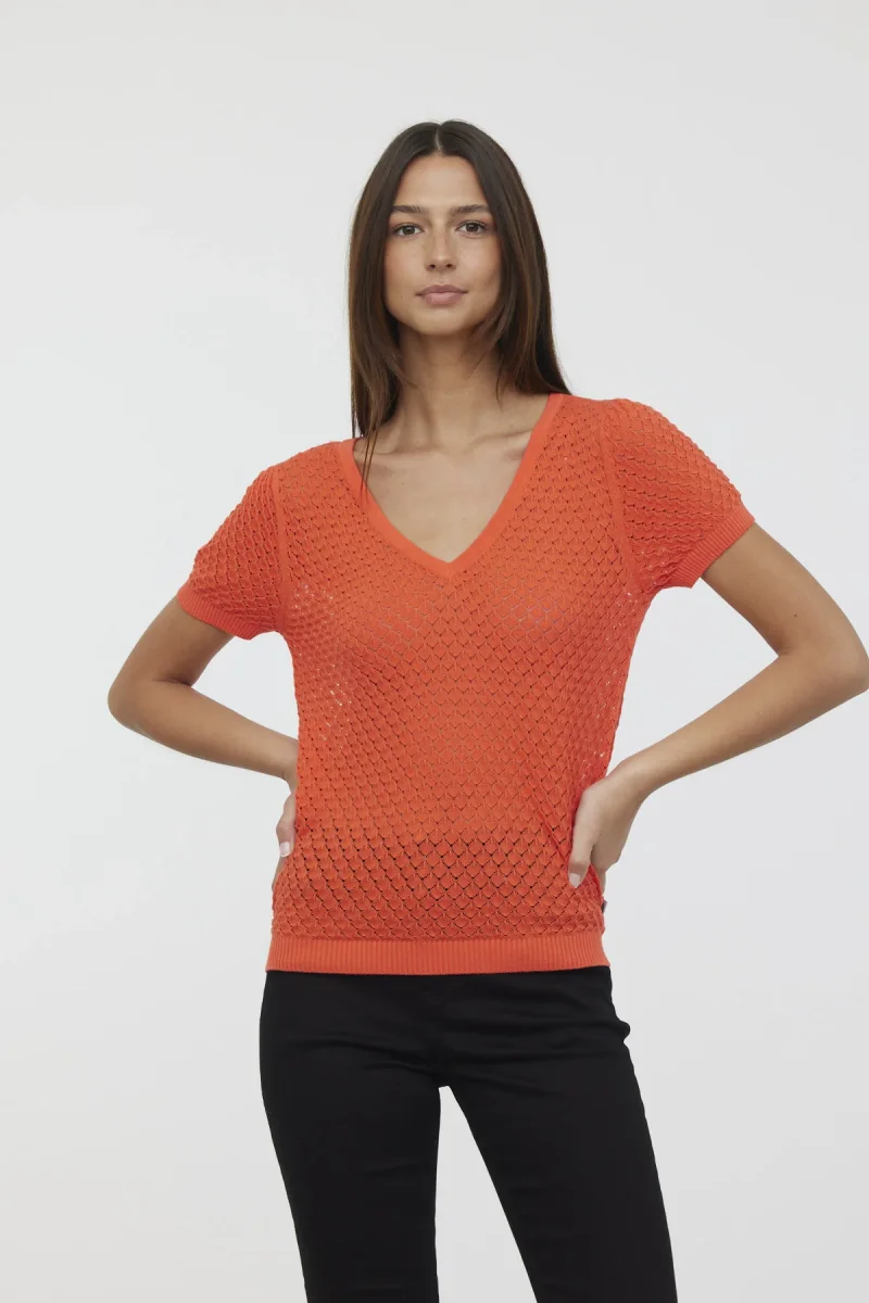 Pull manches courtes col V profond, maille fantaisie ajourée