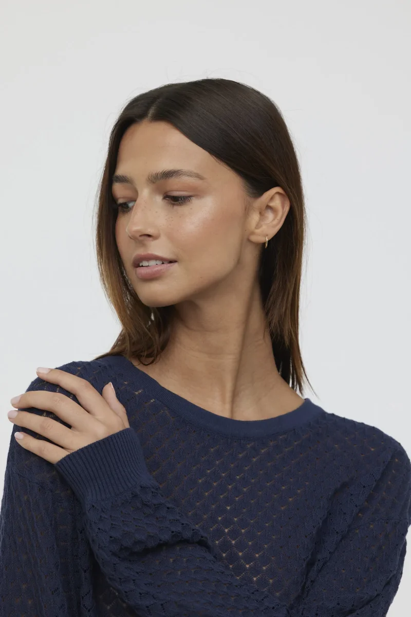 Pull col rond manches longues boufantes maille fantaisie ajourée Le mannequin mesure 1.70 cm et porte la taille S