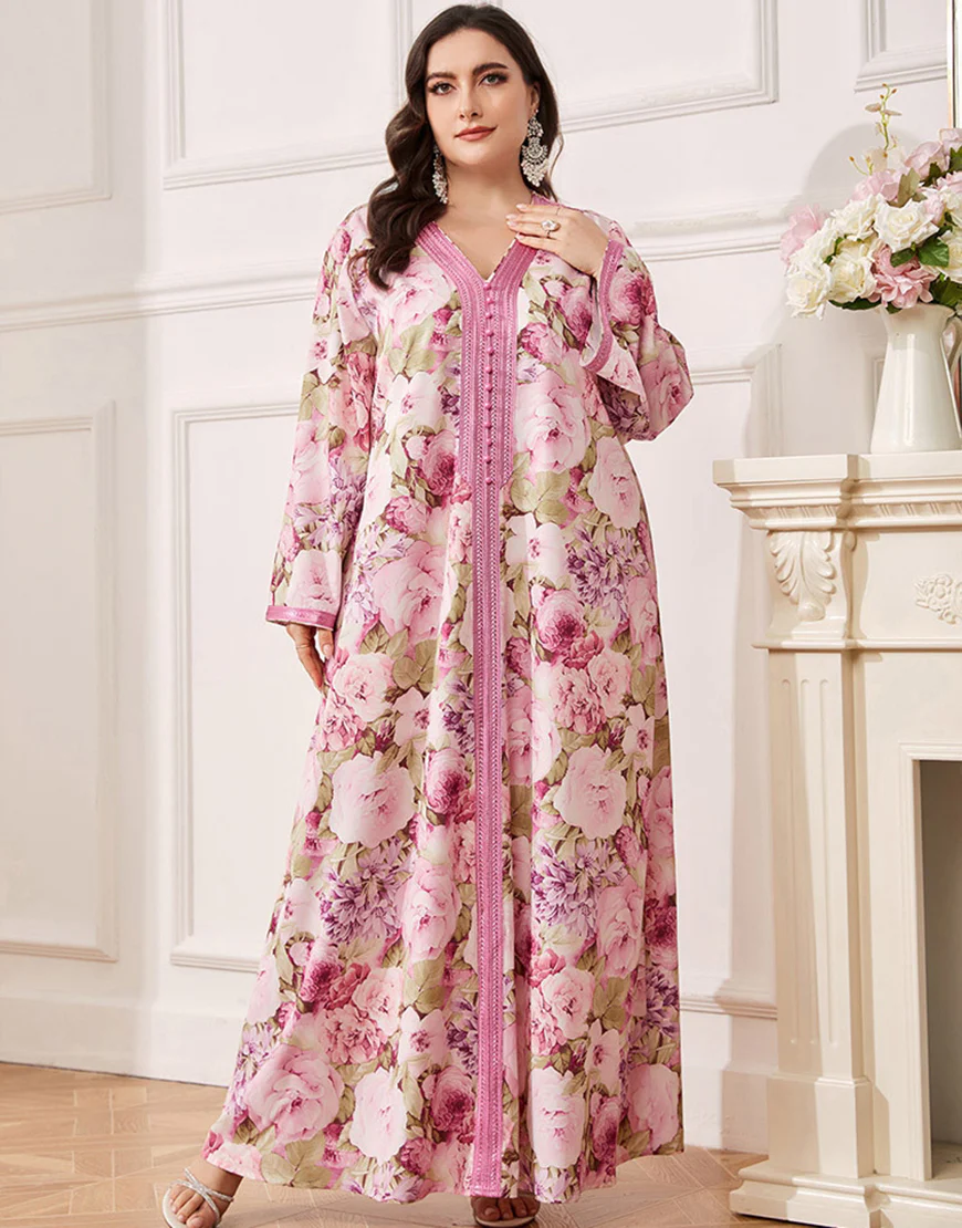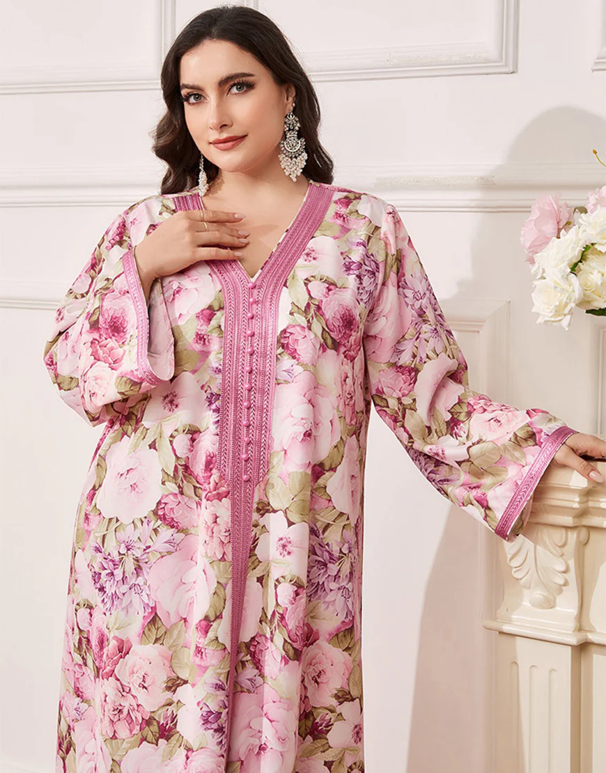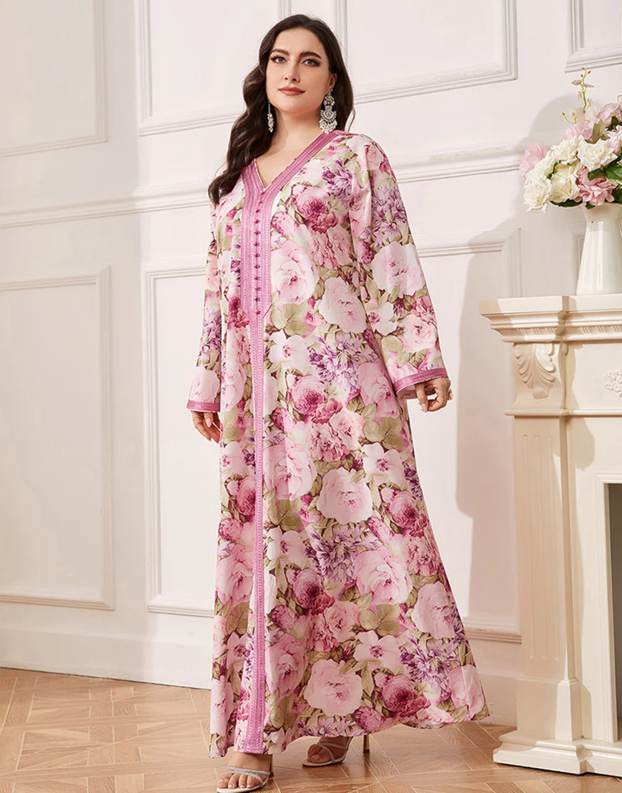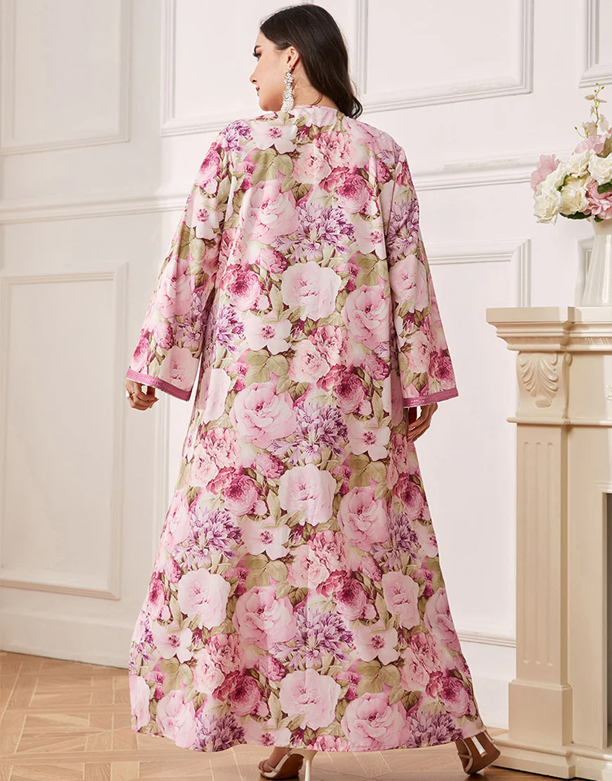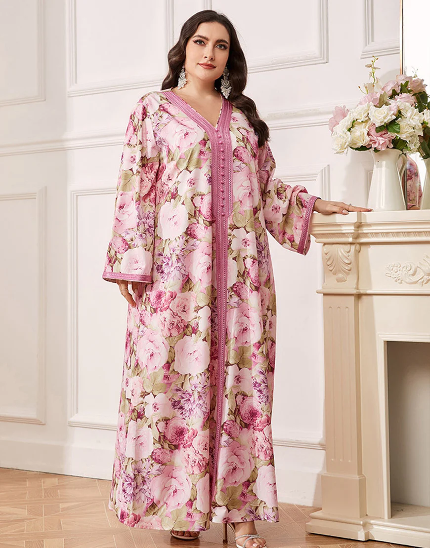 Robe caftan Abaya grande taille à fleurs Rose Pin avec ceinture