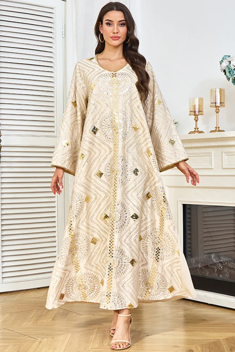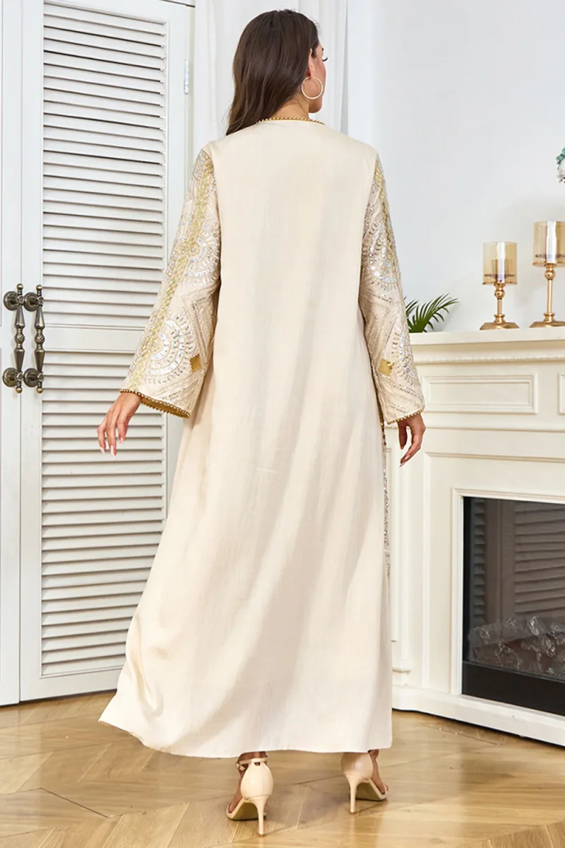 Robe caftan abricot à col rond et perles