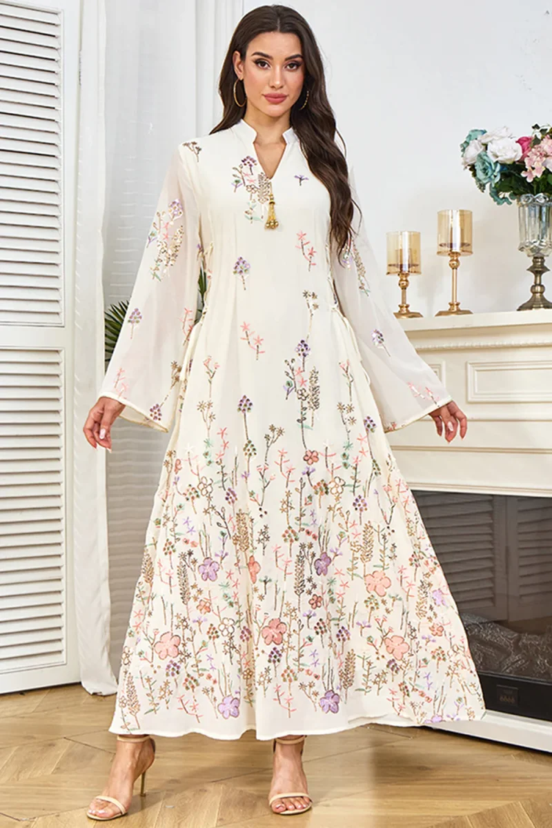 Blanc Bleu Imprimé fleuri Col en V Robe Caftan
