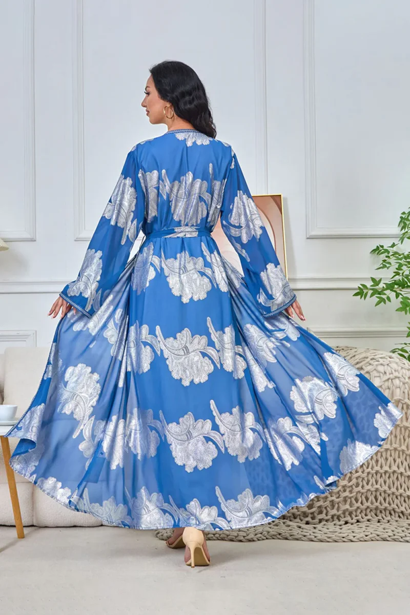 Robe caftan bleue à imprimé floral et col en V