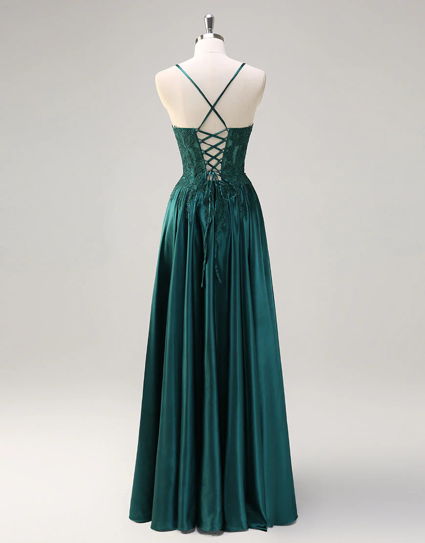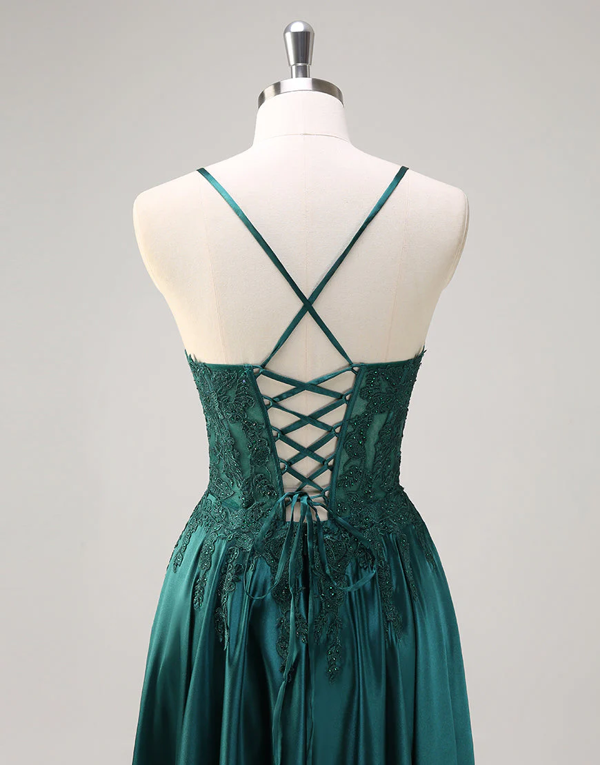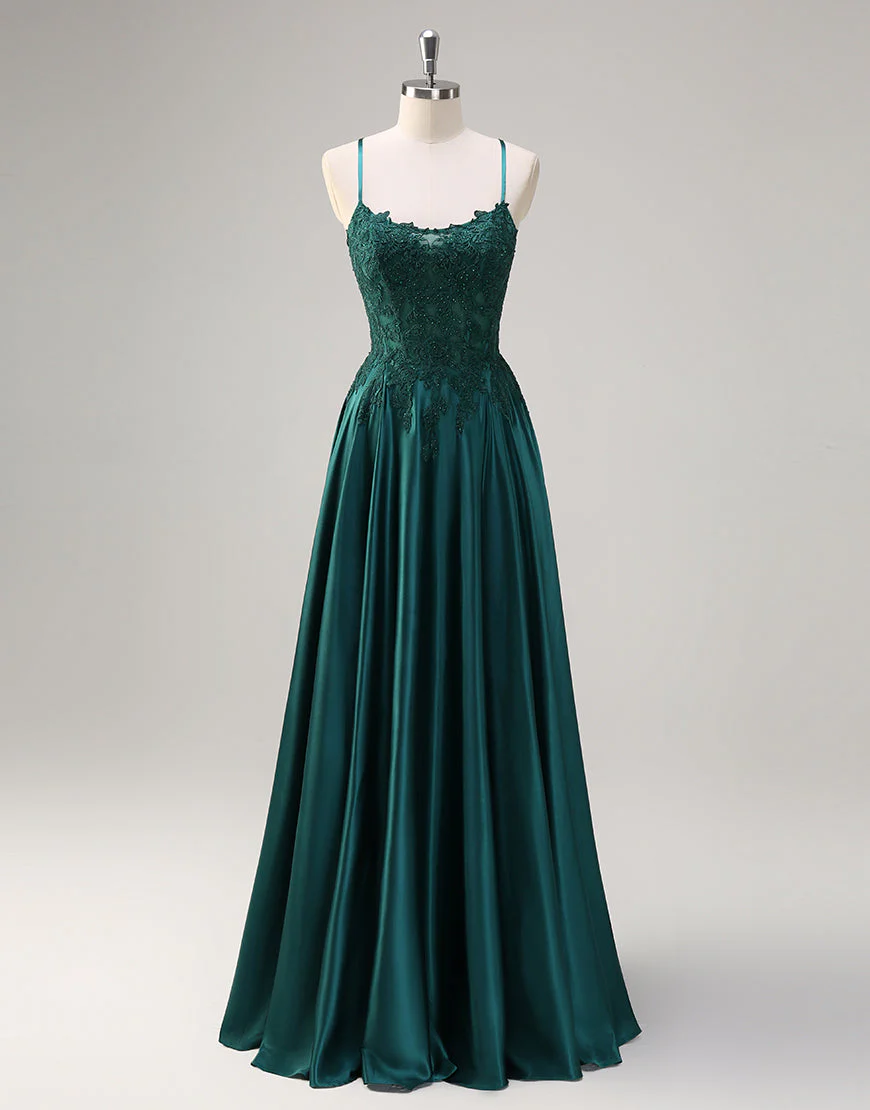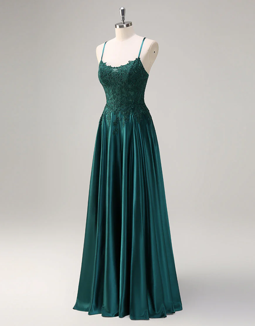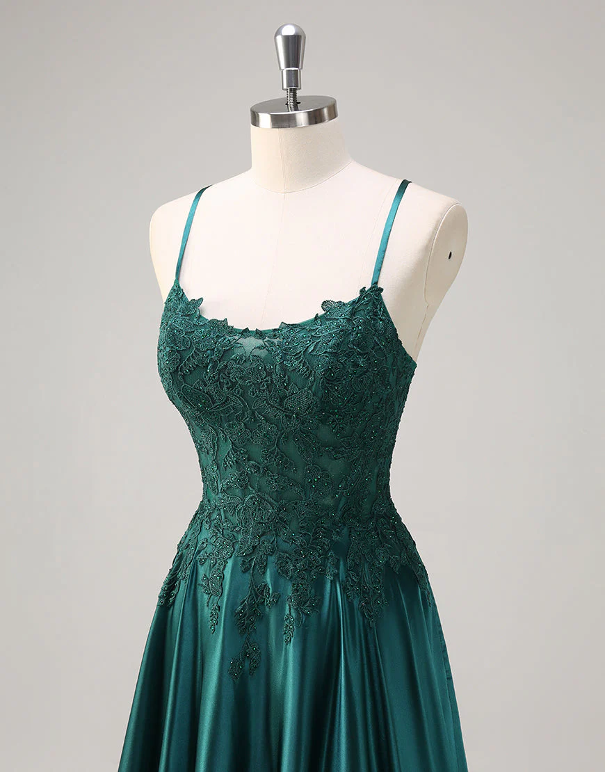 Design: Cette robe de bal dans un magnifique vert foncé est idéale pour un look élégant et sophistiqué. Les fines bretelles en spaghetti sans manches et le dos nu apportent une touche de sensualité, tandis que les appliques en dentelle ajoutent une dimension subtile à cette robe trapèze. Les lacets et la longueur au sol complètent l’ensemble pour un ajustement parfait. Parfait pour les occasions spéciales et les événements formels.