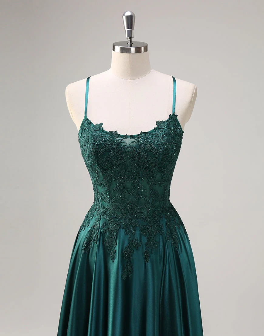 Robe de bal à fines bretelles avec appliques en dentelle vert foncé