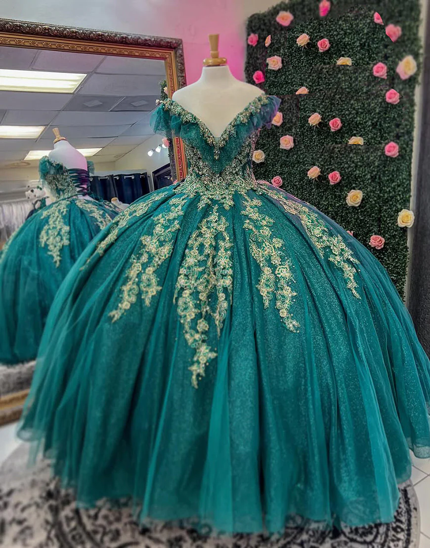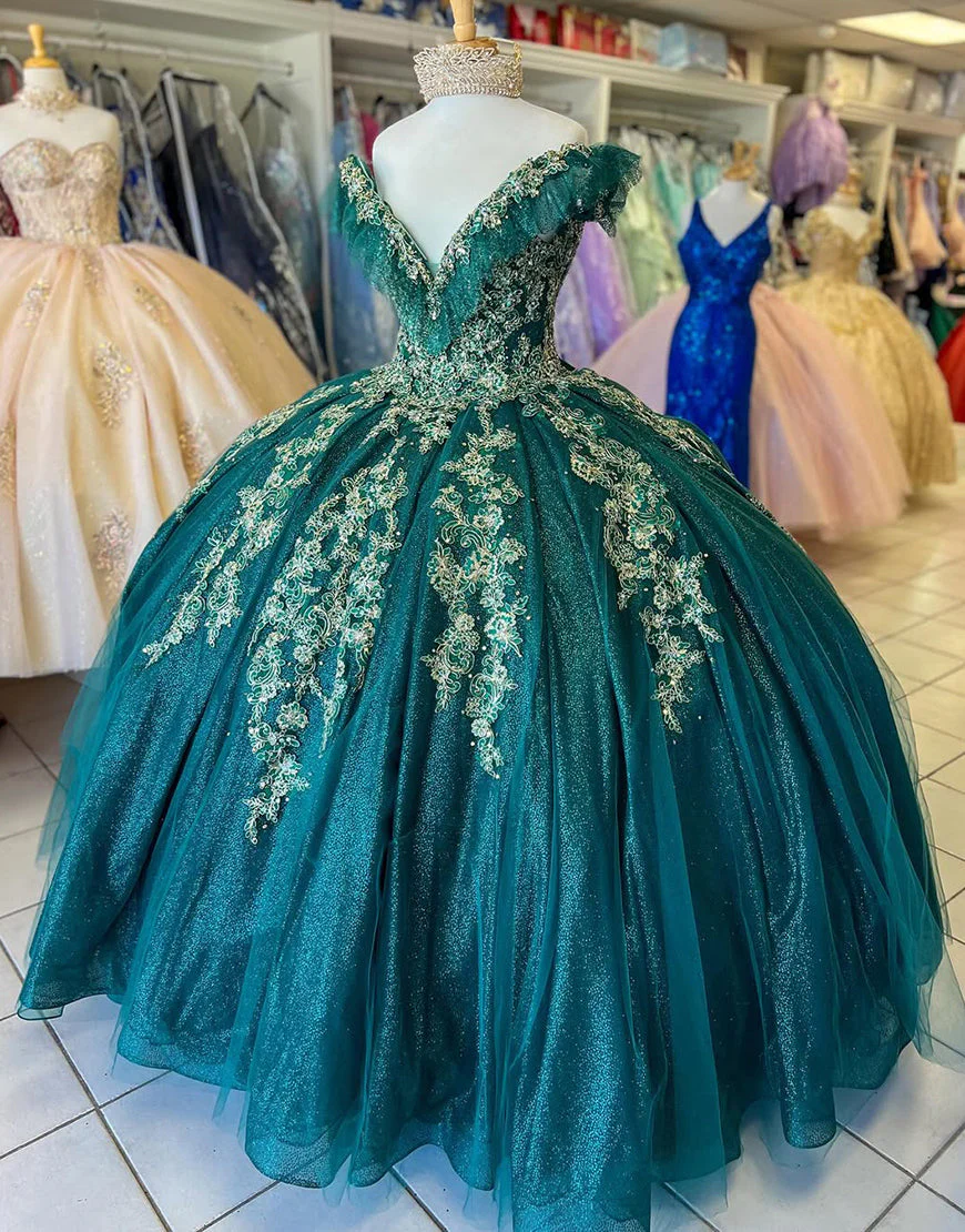 Robe de bal à paillettes vertes à col en V et sans bretelles avec appliques