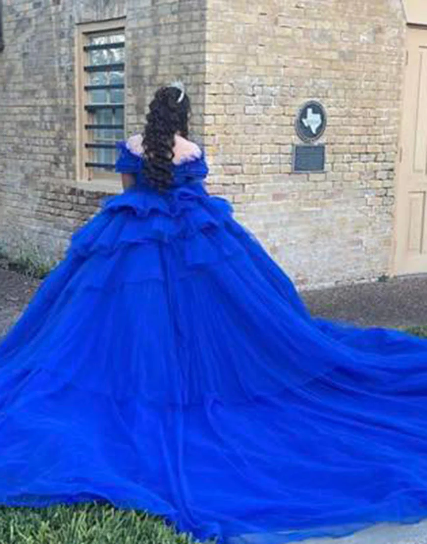 Design: Cette robe de bal bleu royal en tulle est un choix élégant pour votre Quinceanera. Les épaules dénudées et la longue traîne ajoutent une touche de glamour tandis que le tissu en tulle léger offre un confort et une liberté de mouvement. Parfait pour danser toute la nuit dans un style royal.