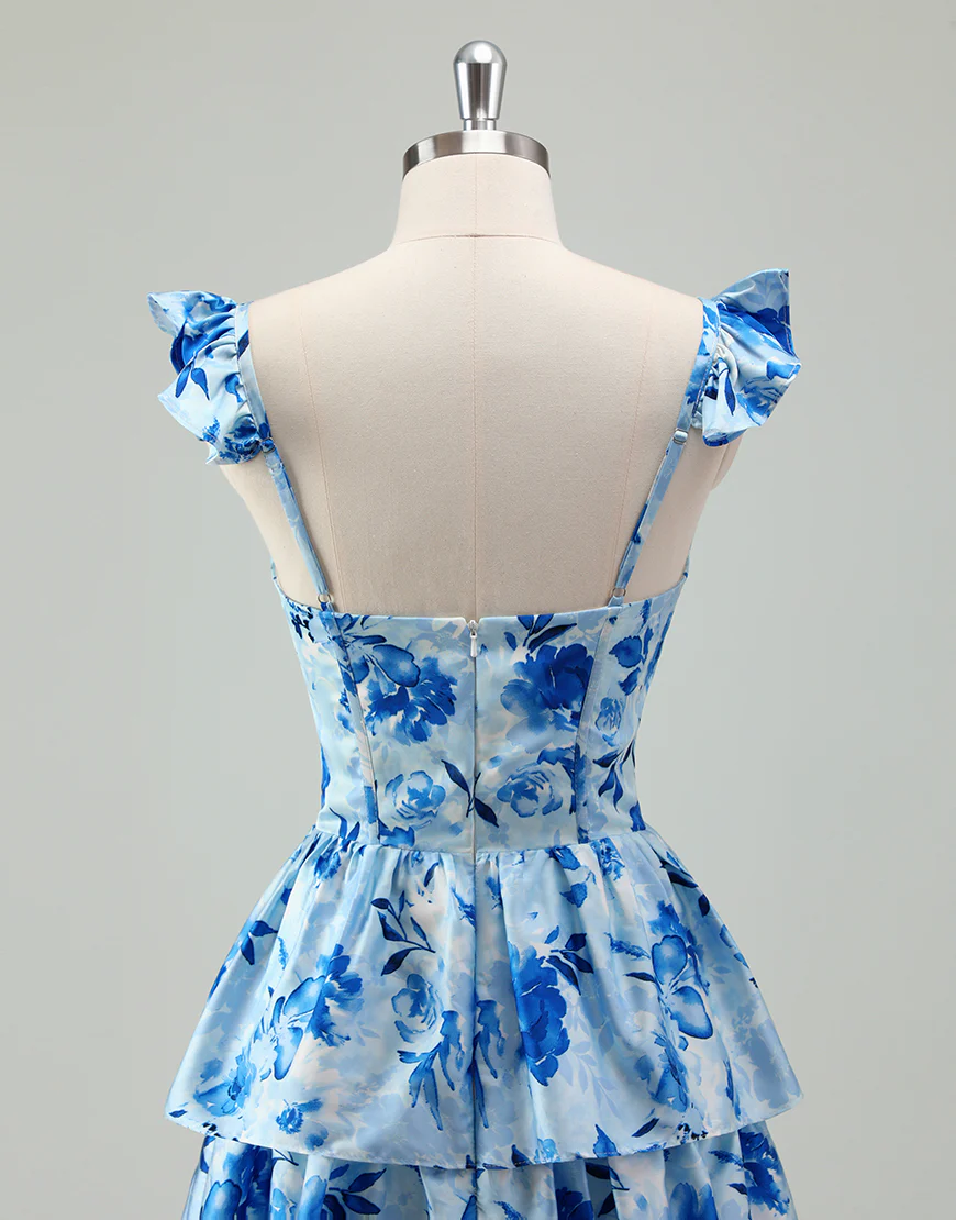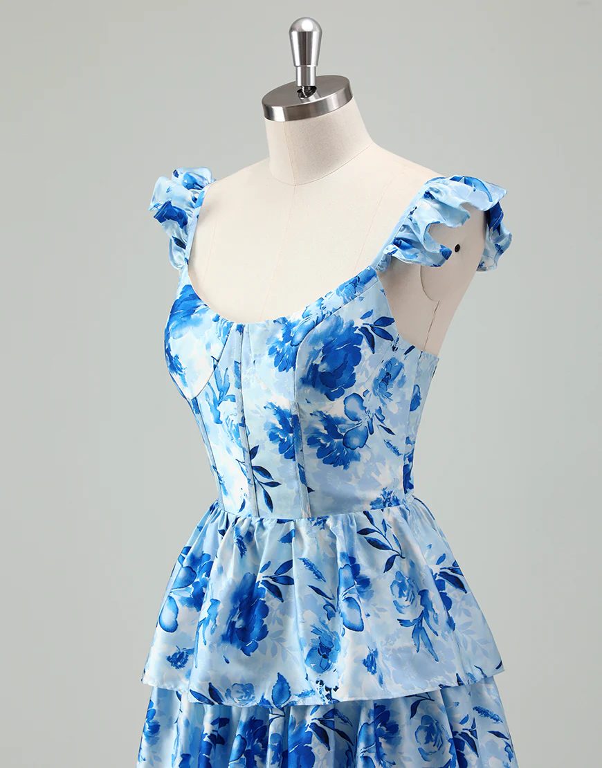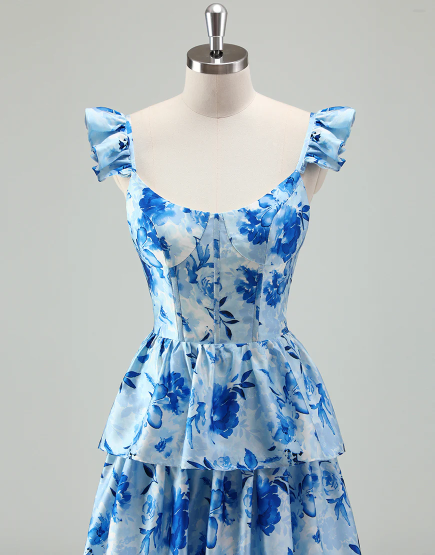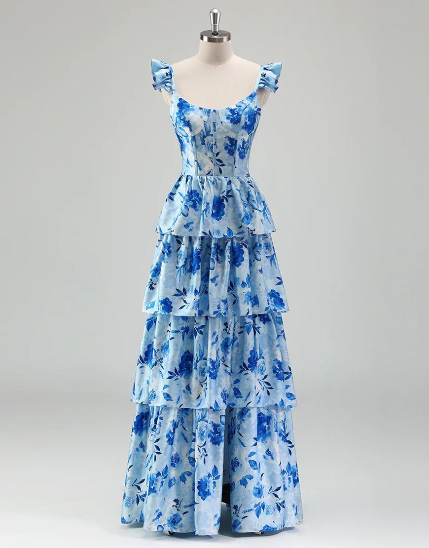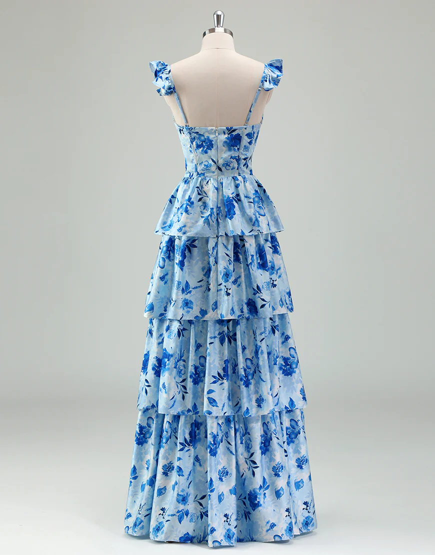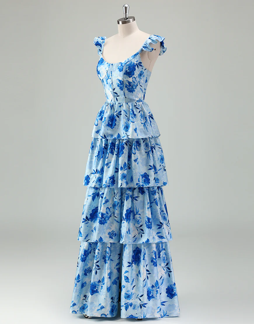 Robe de bal bleue en ligne A, avec un décolleté en poche et des volants en cascade