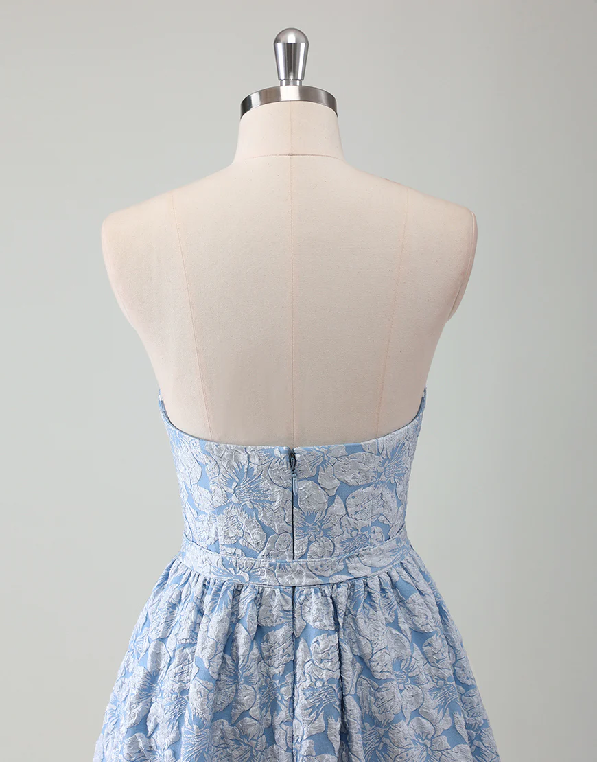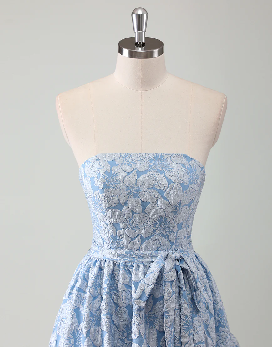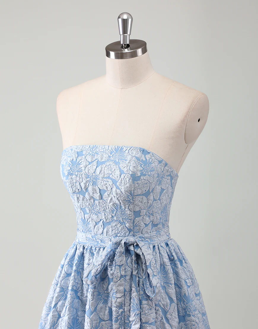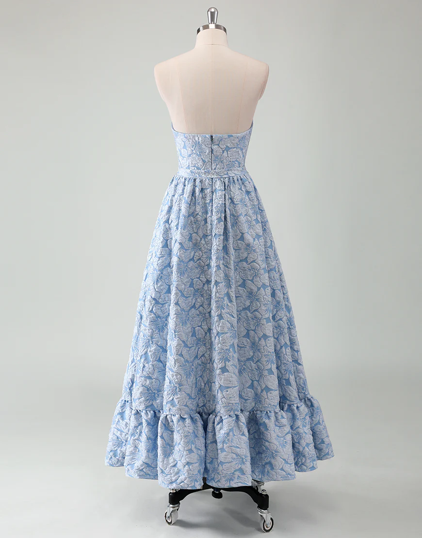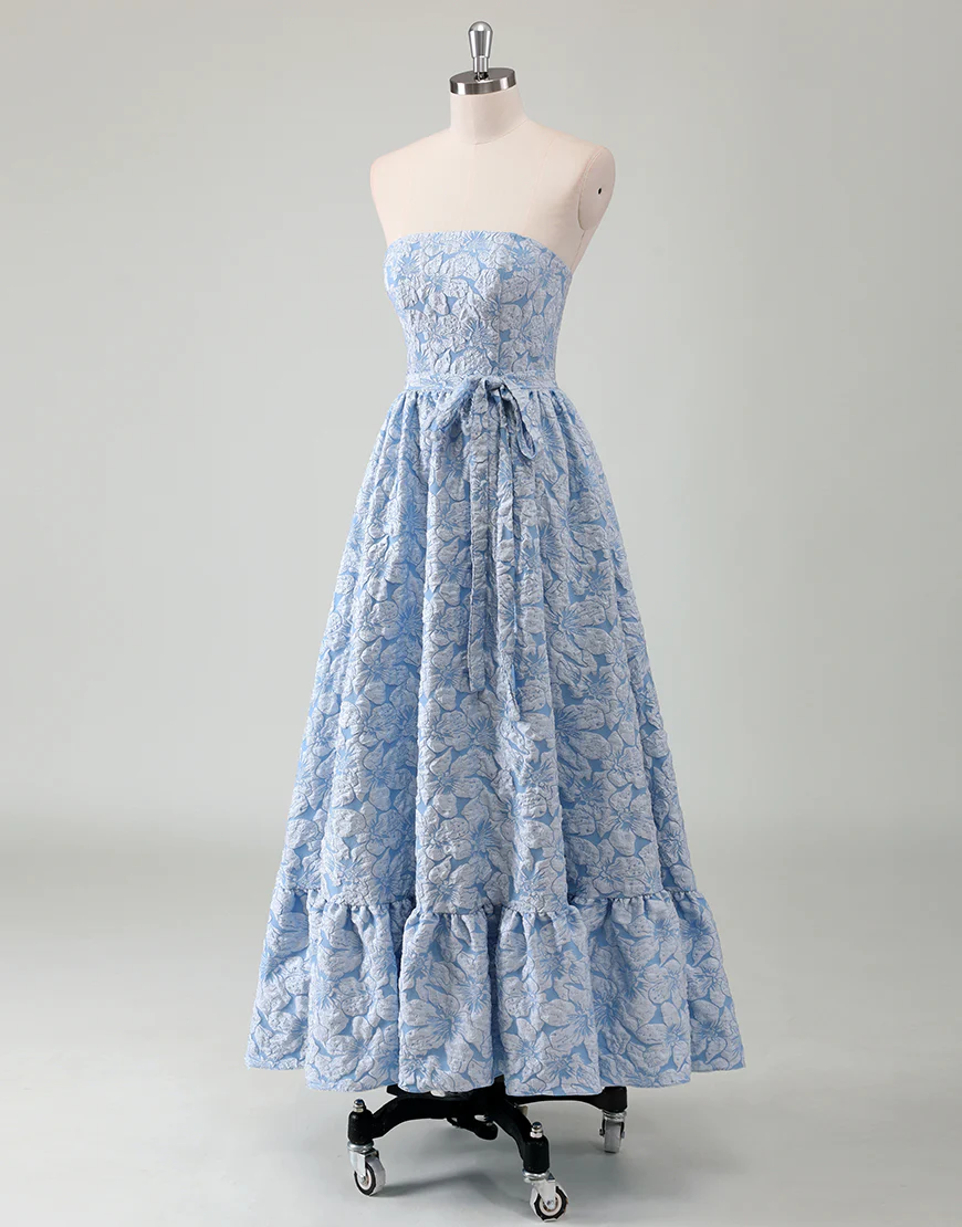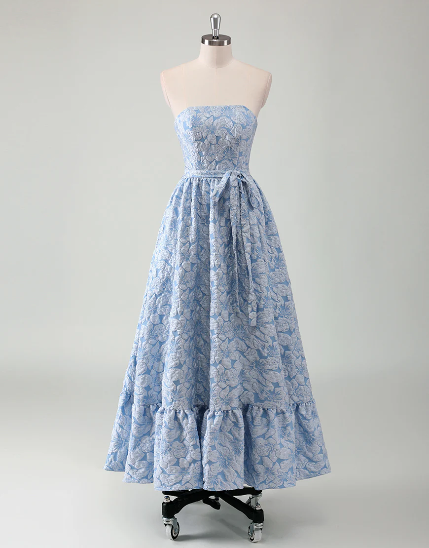 Réalisée en ligne A, cette robe de bal bleue sans bretelles est une tenue élégante et décontractée pour toute soirée. Avec une ceinture intégrée, les courbes féminines sont mises en valeur tout en offrant un confort absolu. Les appliques et la fermeture éclair ajoutent une touche de sophistication à cette robe sans manches décolletée à l’arrière.