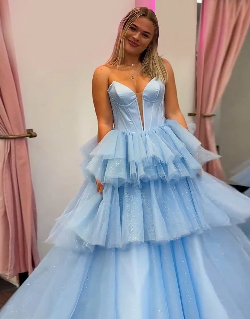 Robe de bal bleue en tulle à volants en cascade et sans bretelles